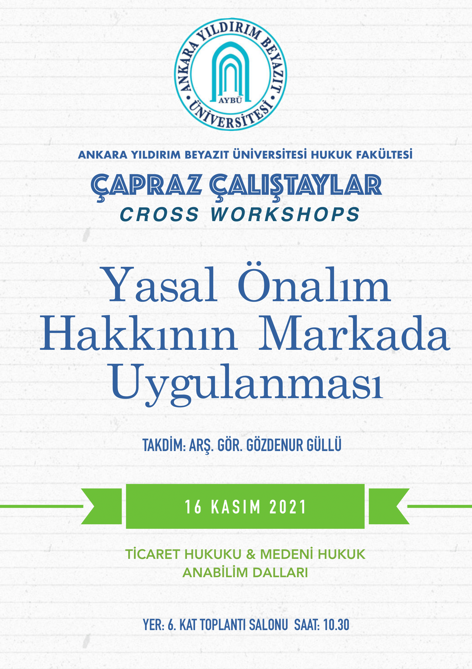 Fakültemizde Çapraz Çalıştayların 3'üncüsü 16 Kasım 2021 tarihinde düzenlenecek olup, "Yasal Önalım Hakkının Markada Uygulanması" başlıklı konu Arş. Gör. Gözdenur Güllü tarafından takdim edilecek ve aşağıda belirtilen hususlar değerlendirilecektir.