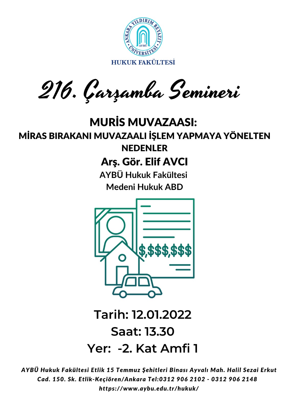 216. Çarşamba Seminerinde Arş. Gör. Elif AVCI tarafından “Muris Muvazaası: Miras Bırakanı Muvazaalı İşlem Yapmaya Yönelten Nedenler” başlıklı sunum gerçekleştirilecektir.