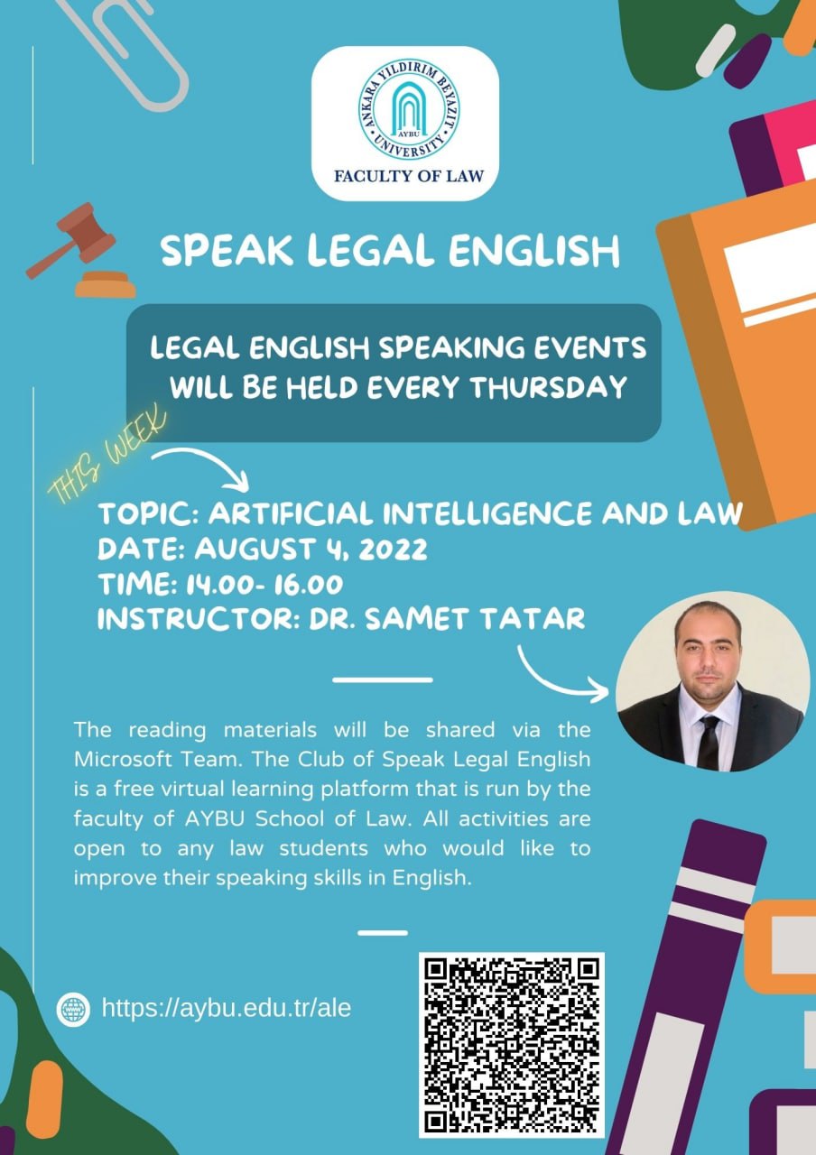 Ankara Yıldırım Beyazıt Üniversitesi Hukuk Fakültesi olarak alanında uzman hocalarımız tarafından her hafta “Hukuk İngilizcesi Konuşma Etkinlikleri” düzenlenecektir. Programımız her hafta Perşembe günü saat 14:00-16:00 arasında gerçekleştirilecek olup yaz dönemi boyunca sekiz hafta devam edilmesi planlanmaktadır. Güncel hukuki meselelerin tartışılacağı ilgili her haftanın konusunu içeren materyaller, etkinlikten bir gün önce konuşmacı hocamız tarafından siz değerli katılımcılarımızla paylaşılacaktır. Etkinliğimiz tamamen ücretsiz olup diğer üniversitelerde hukuk eğitimi alan tüm öğrencilere açıktır.