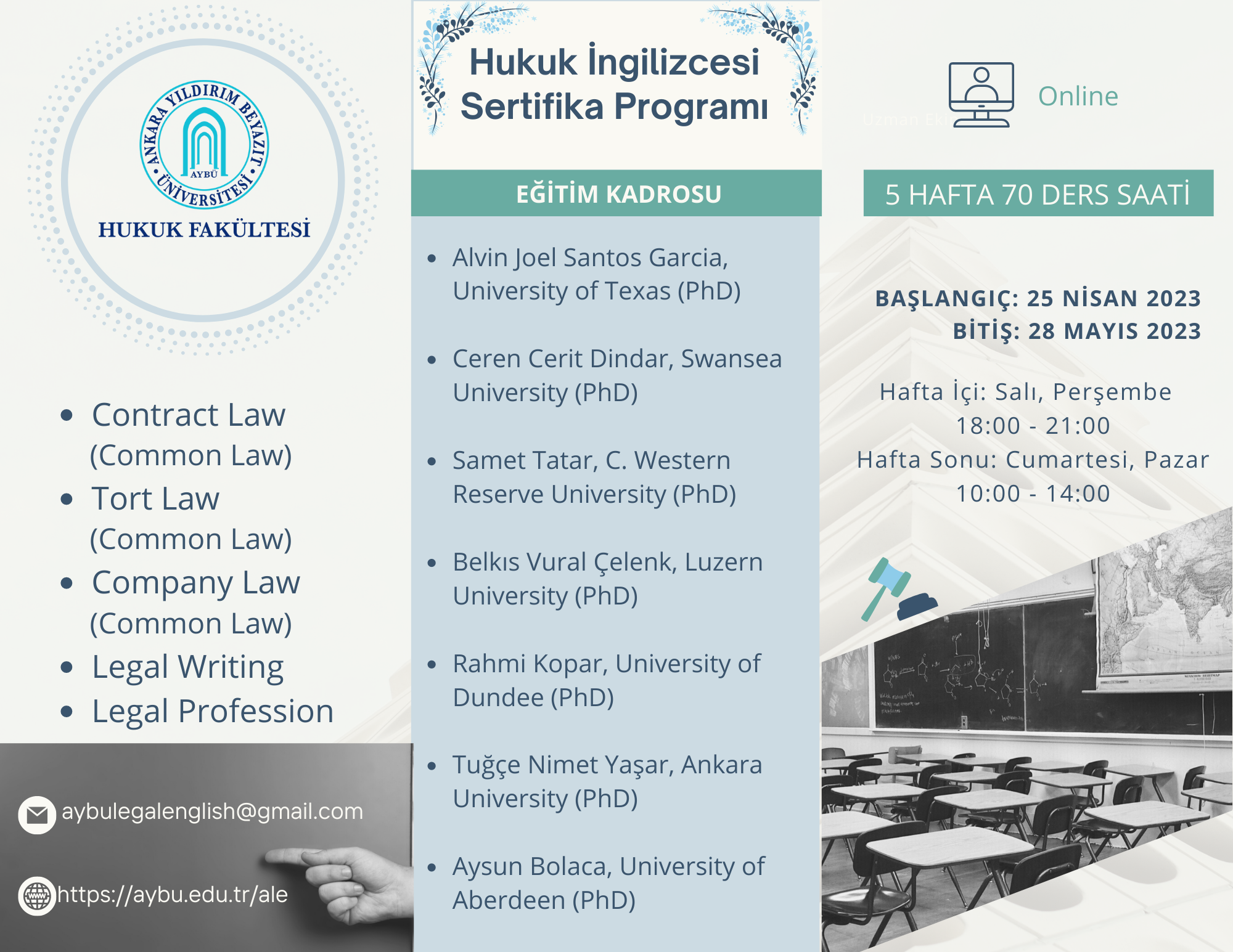 Fakültemizde 21 Şubat – 26 Mart 2023 tarihleri arasında gerçekleştirilmesi planlanan Hukuk İngilizcesi Sertifika Programı, etkileri devam eden deprem nedeniyle ertelenmiştir.
