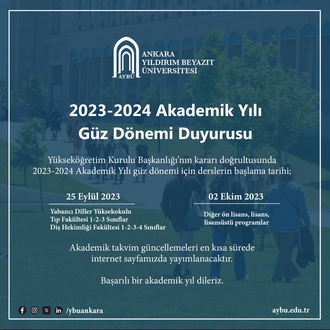 - Diğer ön lisans, lisans ve lisansüstü programlar 2 Ekim 2023 olarak düzenlenmiştir.
