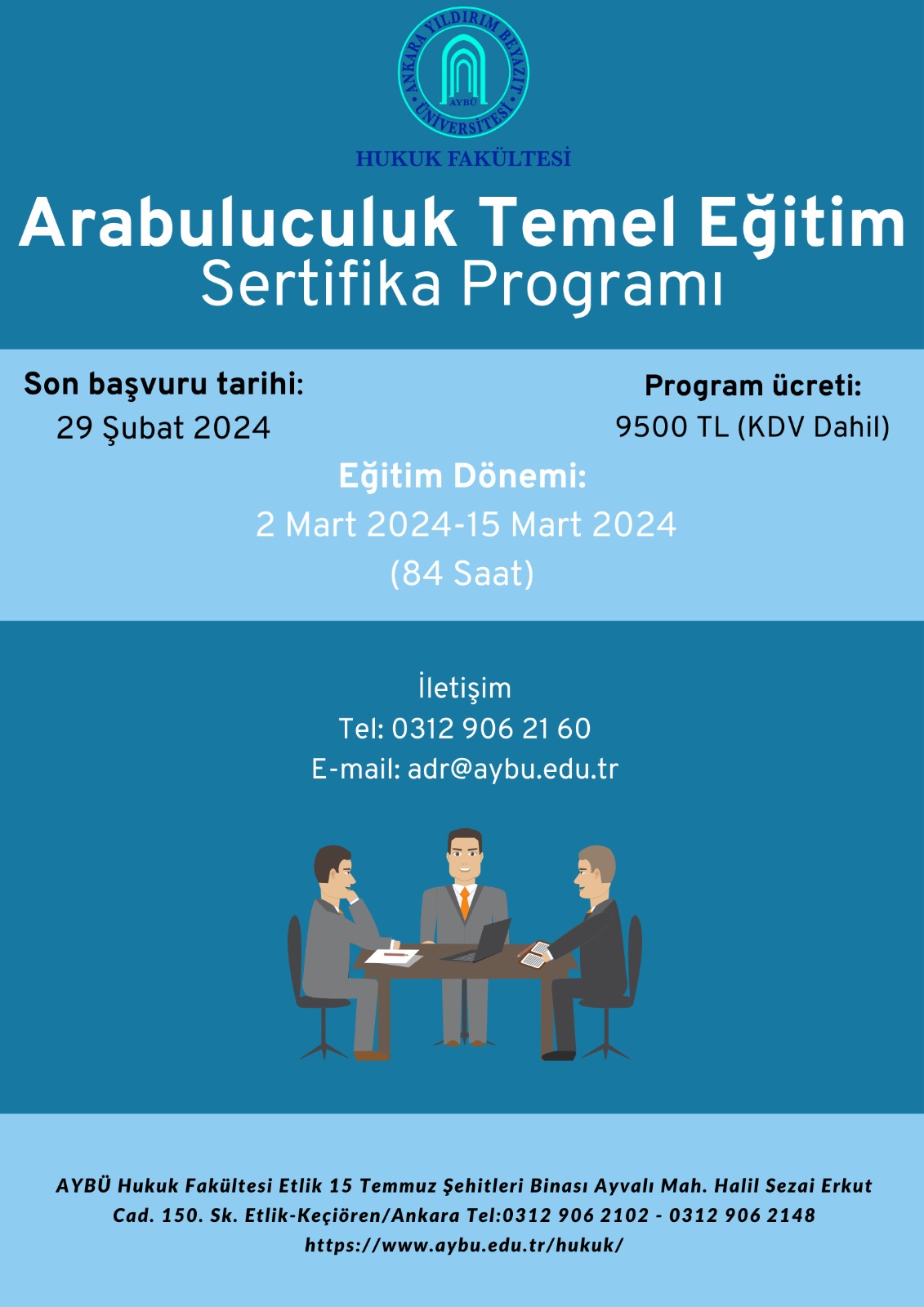 2-15 Mart 2024 tarihleri arasında yüz yüze olmak üzere Arabuluculuk Temel Eğitimi Programı düzenlenecektir. Program toplam 84 saatten oluşmaktadır. Eğitim ücreti 9.500 TL (KDV dâhil) olup, katılımcı sayısı 30 kişi ile sınırlıdır.
