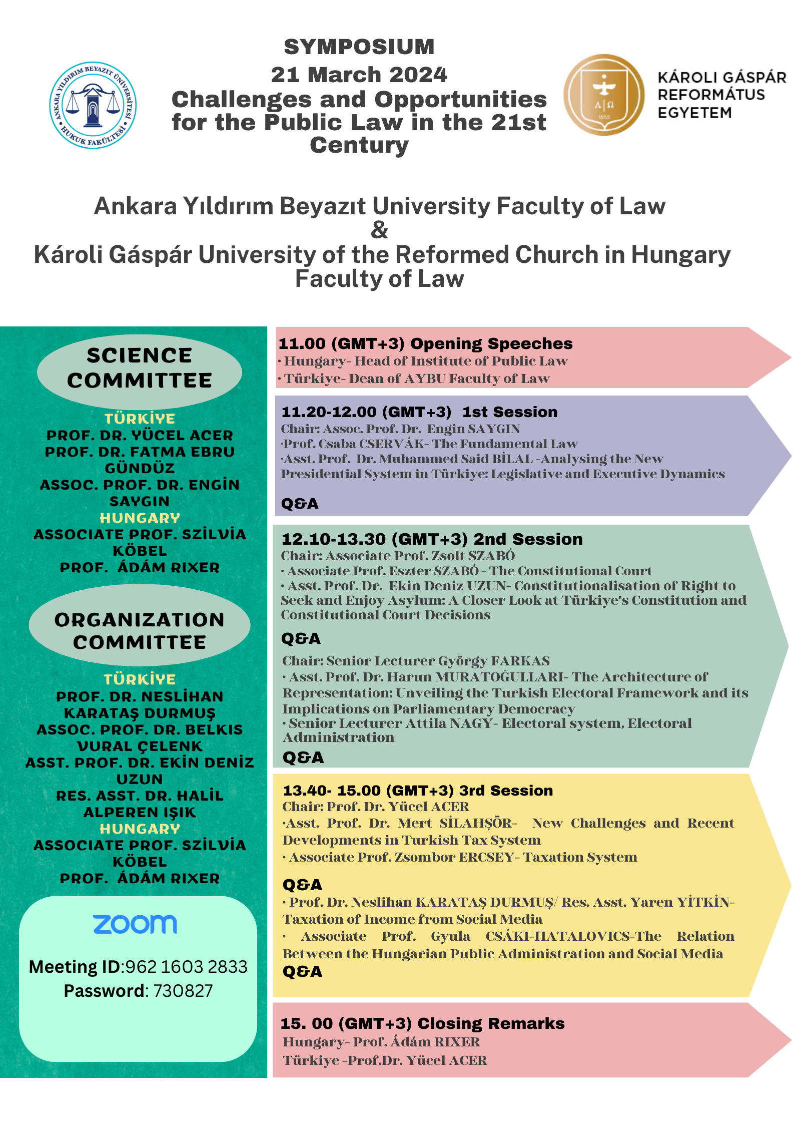 Ankara Yıldırım Beyazıt Üniversitesi Hukuk Fakültesi, Karoli Gaspar University of the Reformed Church in Hungary iş birliği ile 21.03.2024 tarihinde (TSİ 11.00) “Challenges and Opportunities for the Public Law in the 21st Century” konulu uluslararası sempozyum düzenlenecektir. Zoom üzerinden gerçekleştirilecek olan Sempozyuma afiş üzerinde yazılı erişim bilgileri aracılığı ile ulaşabilirsiniz.