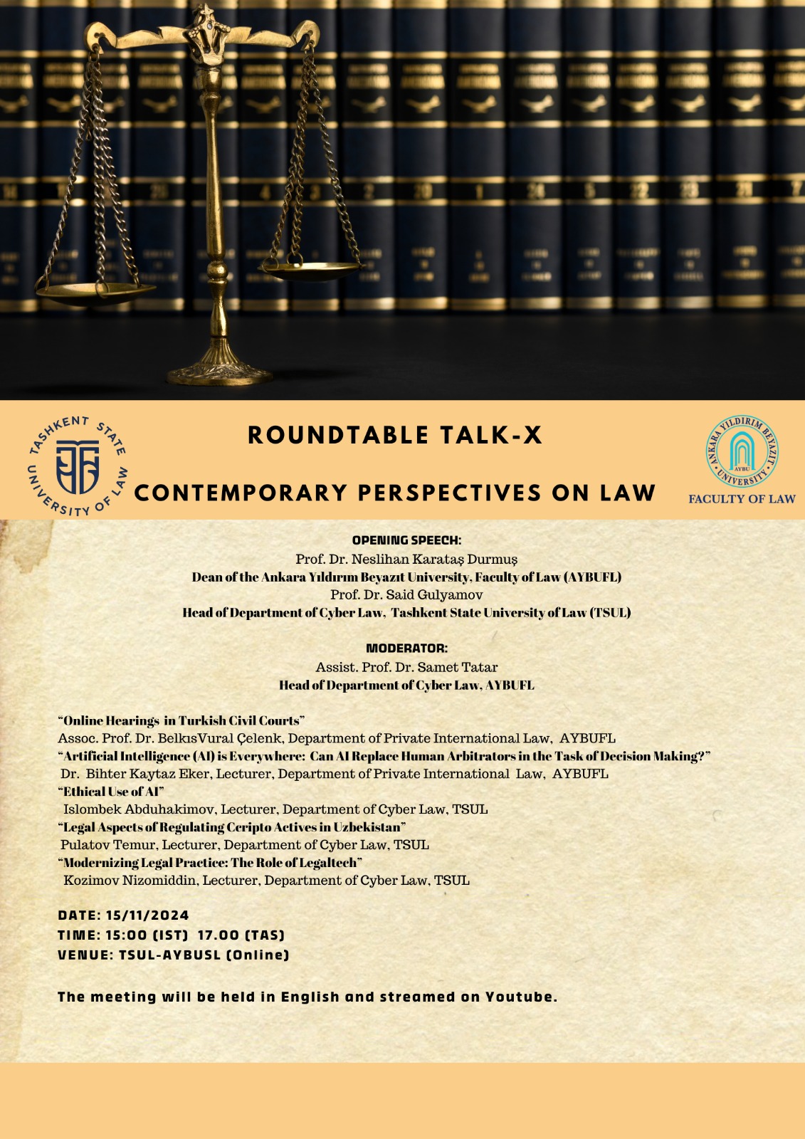 Akademik partnerimiz Taşkent Devlet Hukuk Üniversitesi ve Fakültemiz iş birliğiyle düzenlenen Yuvarlak Masa toplantılarının onuncusunu gerçekleştirmekten büyük memnuniyet duyuyoruz. Toplantımız 15.11.2024 tarihinde Türkiye saati ile 15.00'da çevrimiçi olarak gerçekleştirilecek ve AYBU Hukuk Fakültesi Youtube kanalından canlı olarak yayınlanacaktır . Bu toplantıda, yapay zekanın hukukun çeşitli alanlarına etkileri ve çevrimiçi duruşmalar konuları değerlendirilecektir.