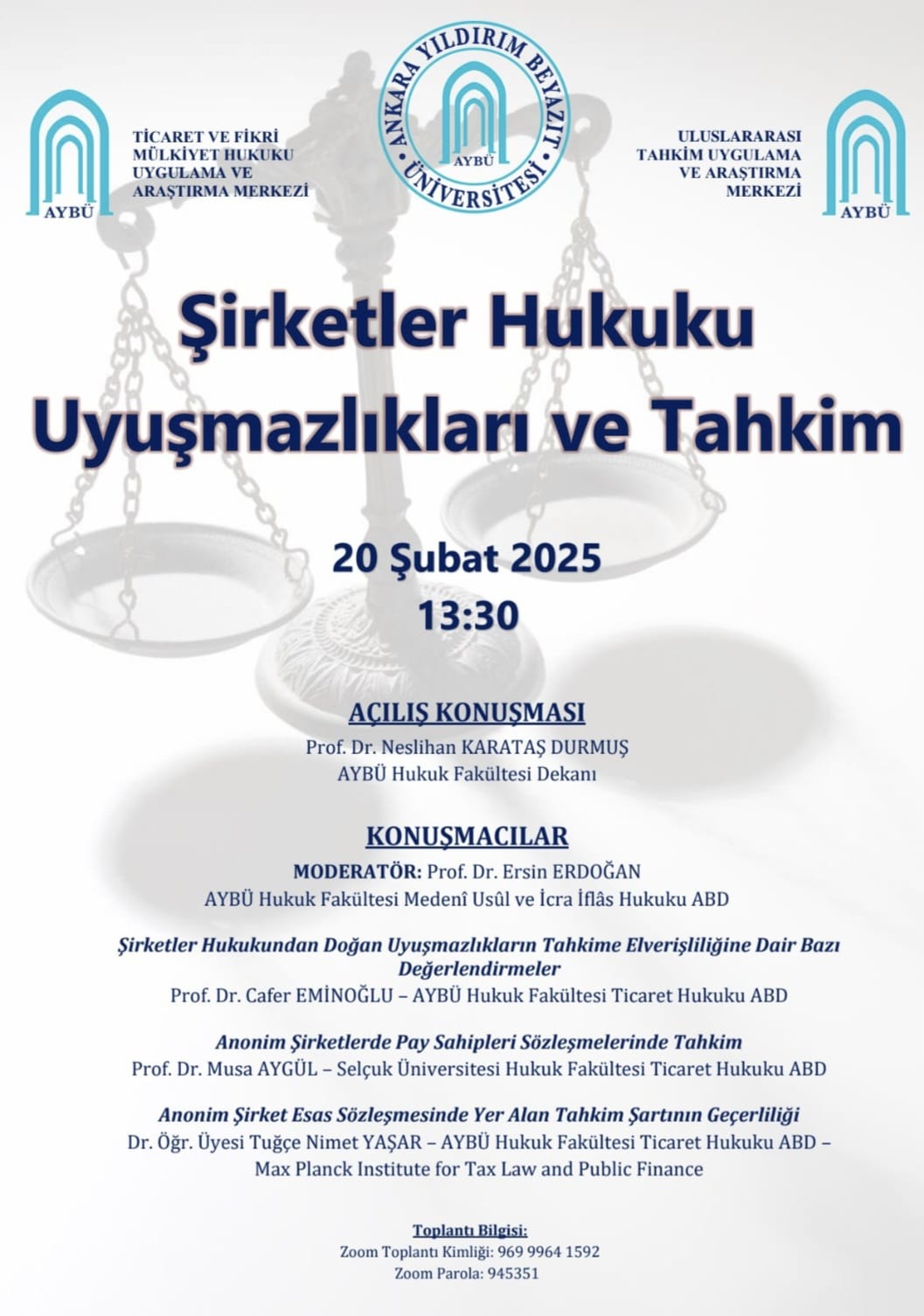 AYBÜ Uluslararası Tahkim Uygulama ve Araştırma Merkezi ve AYBÜ Ticaret ve Fikri Mülkiyet Hukuku Uygulama ve Araştırma Merkezi işbirliği ile “Şirketler Hukuku Uyuşmazlıkları ve Tahkim” başlıklı seminer gerçekleştirilecektir.