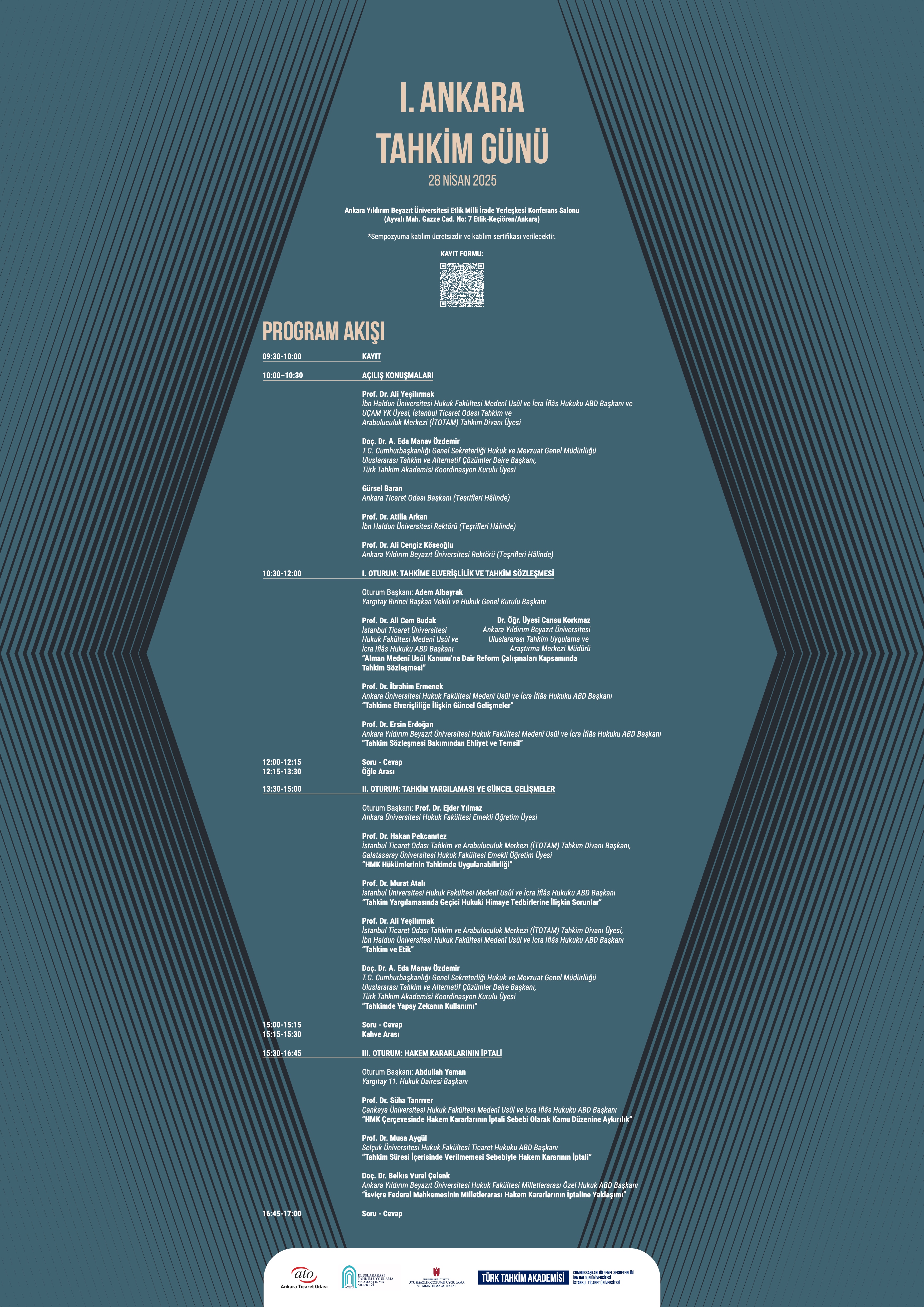 Üniversitemiz Uluslararası Tahkim Uygulama ve Araştırma Merkezi ile Ankara Ticaret Odası, İbn Haldun Üniversitesi Uyuşmazlık Çözümü Uygulama ve Araştırma Merkezi ve Türk Tahkim Akademisi işbirliği ile 28 Nisan 2025 tarihinde, “I. Ankara Tahkim Günü” konulu sempozyum düzenlenecektir. Sempozyum, açılış konuşmalarının ardından "tahkime elverişlilik ve tahkim sözleşmesi", "tahkim yargılaması ve güncel gelişmeler", "hakem kararlarının iptali" olmak üzere üç oturumdan oluşmaktadır.