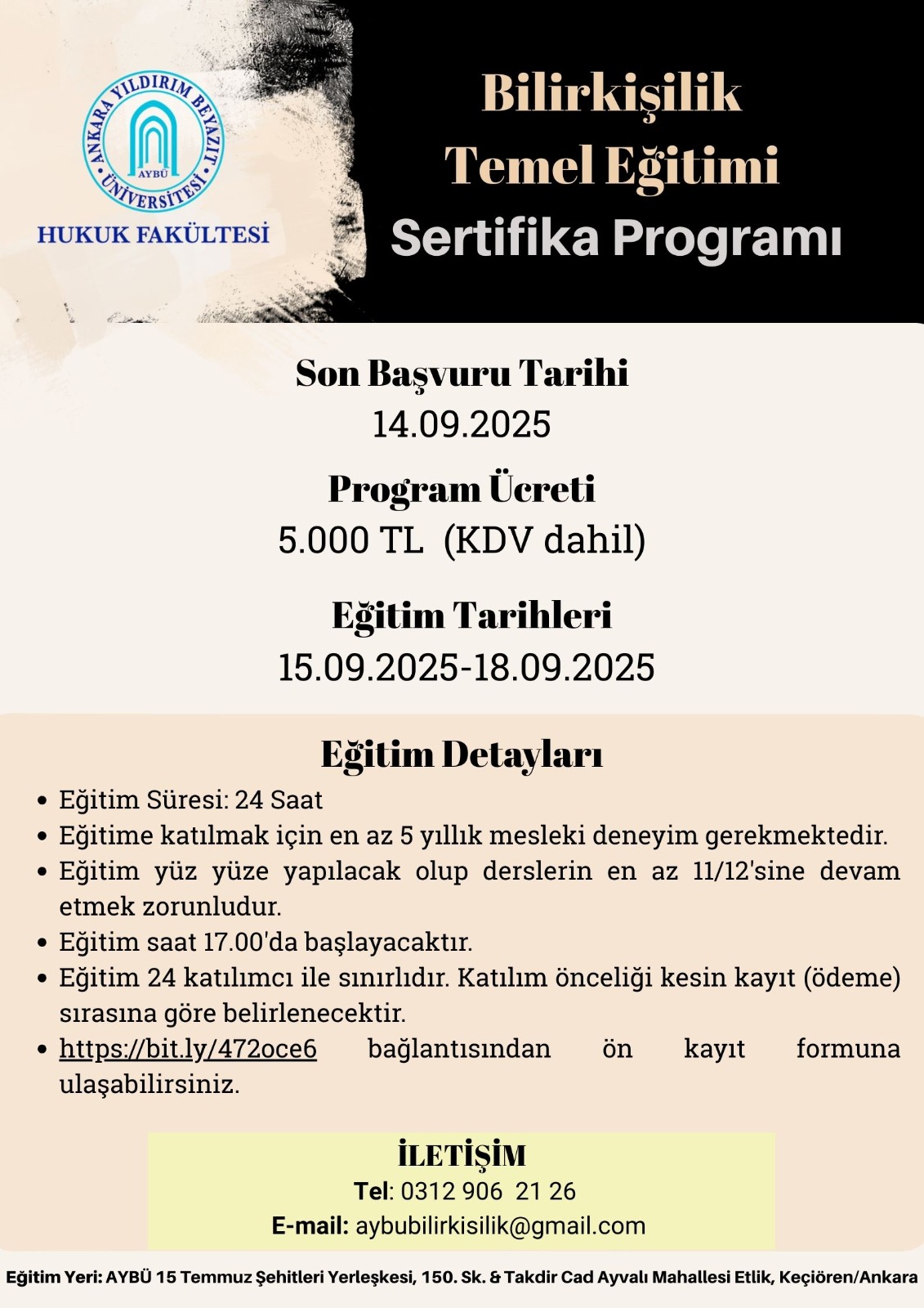 15-18 Eylül 2025 tarihleri arasında, Bilirkişilik Temel Eğitim Programı açılacaktır. 6754 sayılı Bilirkişilik Kanunu’nun 10 maddesi ve Bilirkişilik Yönetmeliği’nin 38. maddeleri gereğince, eğitime mesleklerinde en az beş yıl fiilen çalışmış kişiler katılabilirler.