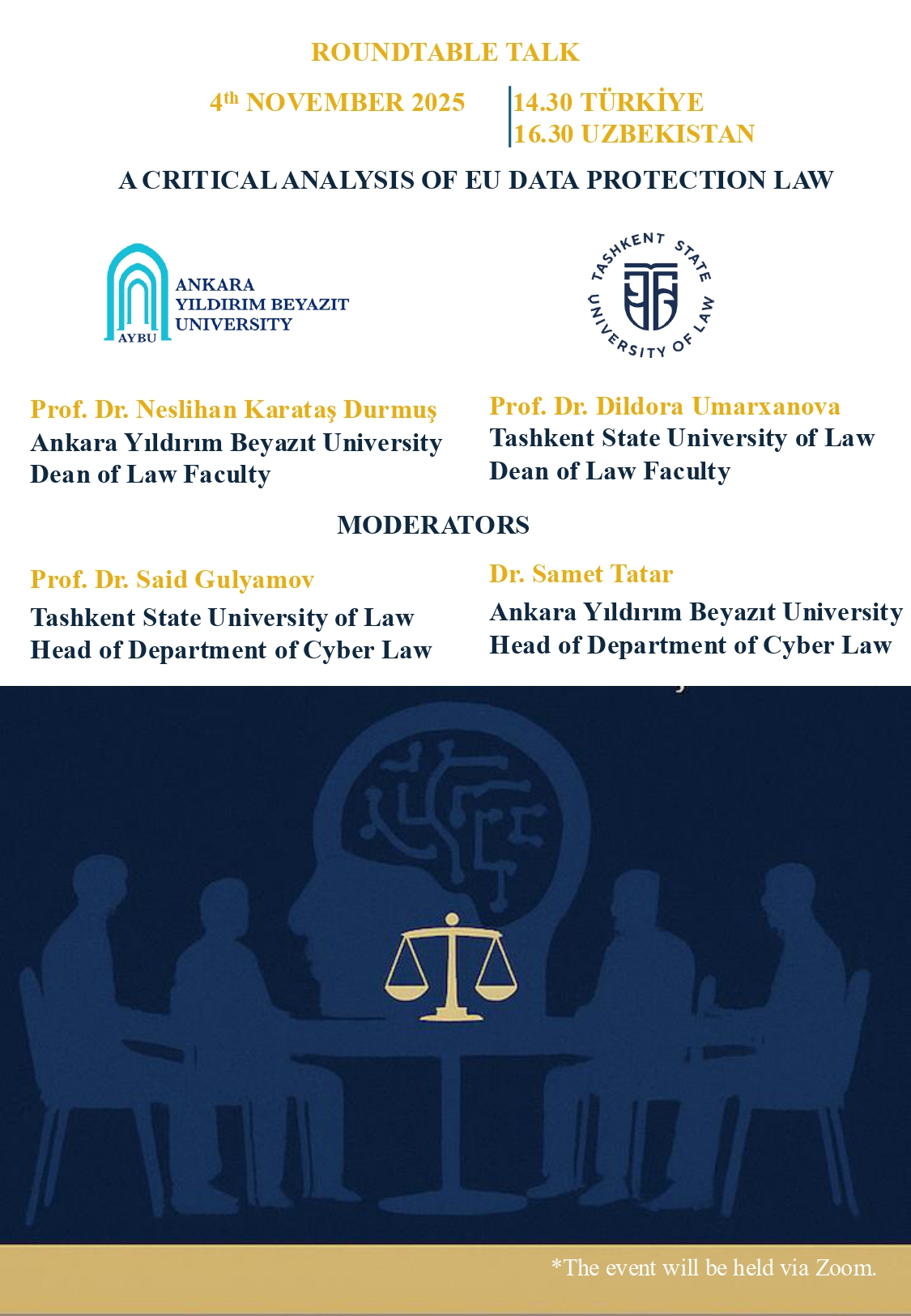 Ankara Yıldırım Beyazıt Üniversitesi ve Taşkent Devlet Hukuk Üniversitesi iş birliğiyle düzenlenen geleneksel Roundtable Talk etkinliği, bu yıl 4 Kasım 2025 tarihinde çevrim içi olarak gerçekleştirilecek.