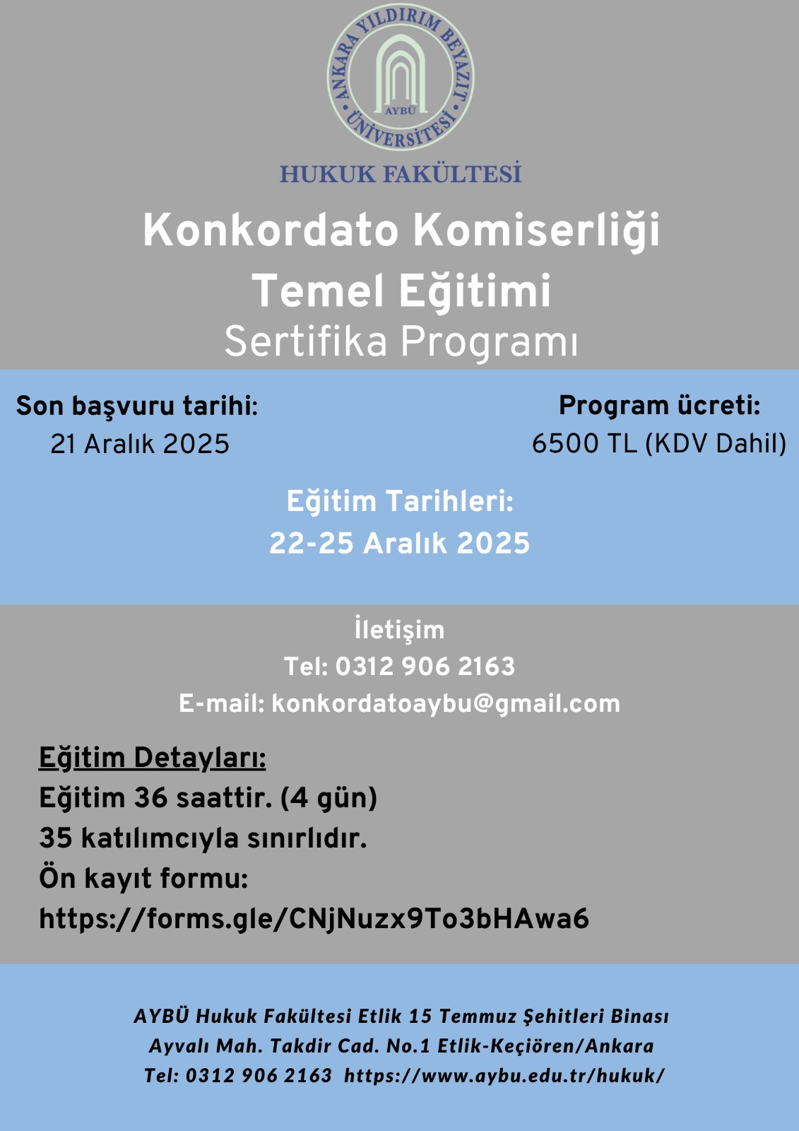 Program toplam 36 saatten (4 gün) oluşmaktadır. Eğitim ücreti 6.500 TL (KDV dâhil) olup, katılımcı sayısı 35 kişi ile sınırlıdır. Mevzuat uyarınca, Konkordato Komiserliği Eğitimine katılabilmek için beş yıldan az olmamak üzere mesleki tecrübeye sahip bulunmak gerekmektedir. Eğitime devam zorunluluğu bulunmaktadır. Derslerin 1/12’sine devam etmeyenlerin eğitim programıyla ilişiği kesilecektir. Programa katılmak isteyenlerin aşağıda yer alan ön kayıt linkini doldurmaları gerekmekte olup, ön kayıtlar başvuru sırası dikkate alınarak kesinleştirilecektir. Kayıt yaptıranlara, kesin kayıt ve ödeme yapılması için en kısa sürede geri dönüş sağlanacak olup, son başvuru tarihi 21 Aralık 2025’tir. Bu grubun dolması üzerine ön kayıtlar diğer gruba aktarılacak olup, bu hususta da tarafınıza dönüş yapılacaktır. Başvuru formu için tıklayınız