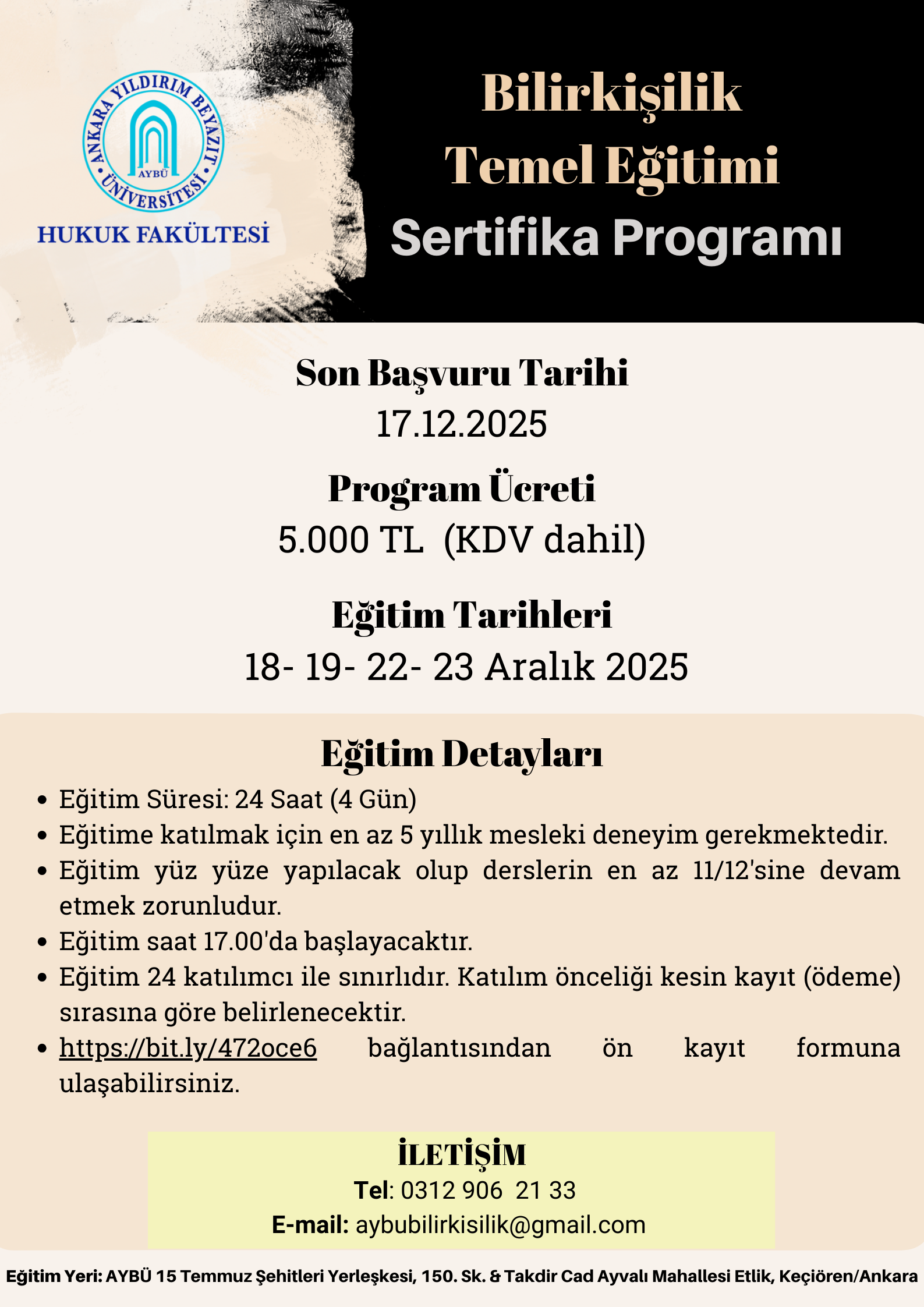 Katılım ücreti 5.000 TL (KDV dâhil) olup, katılımcı sayısı 24 kişi ile sınırlıdır. Programa katılmak isteyenlerin aşağıda yer alan ön kayıt linkini doldurmaları gerekmekte olup, ön kayıtlar başvuru sırası dikkate alınarak kesinleştirilecektir. Kayıt yaptıranlara, kesin kayıt ve ödeme yapılması için en kısa sürede geri dönüş sağlanacak olup, son başvuru tarihi 17 Aralık 2025’tir. Bu grubun dolması üzerine ön kayıtlar diğer gruba aktarılacak olup, bu hususta da tarafınıza dönüş yapılacaktır.