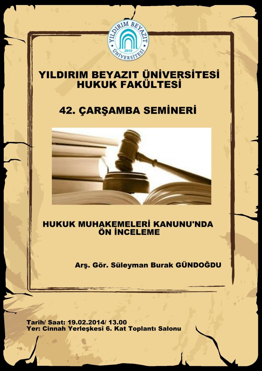 Çarşamba Seminerlerinin 42. haftaki konusu, ""Hukuk Muhakemeleri Kanunu'nda Ön İnceleme" olacaktır. Üniversitemiz Cinnah kampüsünde yapılacak olan seminere öğretim üyelerimiz, araştırma görevlilerimiz, lisansüstü öğrencilerimiz ile konuya ilgi duyanlar davetlidir.