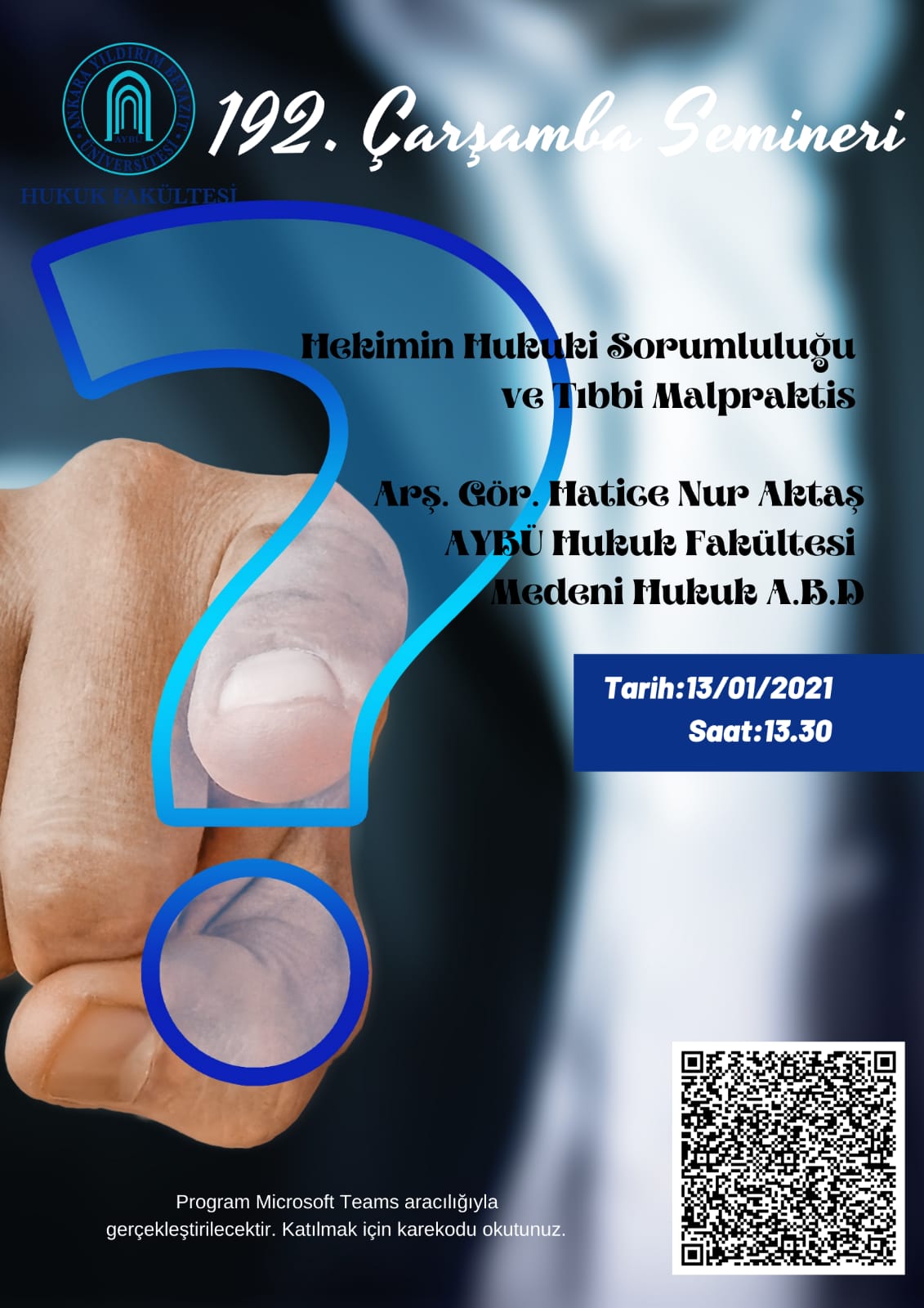 192. Çarşamba Semineri "Hekimin Hukuki Sorumluluğu ve Tıbbi Malpraktis" konulu sunum, AYBÜ Hukuk Fakültesi Medeni Hukuk ABD Arş. Gör. Hatice Nur AKTAŞ tarafından gerçekleştirilecektir.