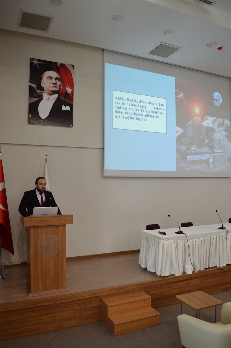 Arş. Gör. Ünal, sunumunda öncelikle genel anlamda uzay madenciliği hakkında bilgi vererek uzay madenciliği faaliyetleri ve bu faaliyetlerin devletler açısından öneminden bahsetmiştir. Akabinde uzay anlaşmaları ve devletlerin iç hukuk düzenlemeleri göz önünde bulundurularak uzay madenciliğinin uzay hukukuna uygunluğunu değerlendirmiştir.