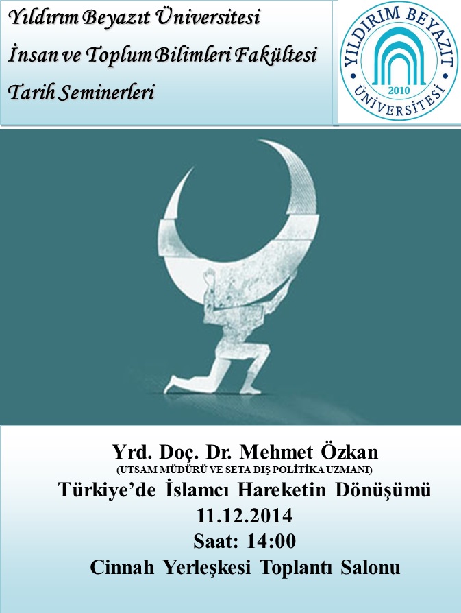 İnsan ve Toplum Bilimleri Fakültesi Tarih Bölümü tarafından düzenlenen Tarih Seminerlerine Utsam Müdürü ve Seta Dış Politika Uzmanı olan Yrd. Doç. Dr. Mehmet ÖZKAN konuk olacaktır. ÖZKAN’ın Türkiye’de İslamcı Hareketin Dönüşümü” adını taşıyan konuşması 11.12. 2014 tarihinde saat 14.00’te Cinnah Yerleşkesi 6. Katta bulunan Toplantın Salonunda gerçekleşecektir. Seminere üniversitemizin tüm öğrencileri ve öğretim üyeleri davetlidir.