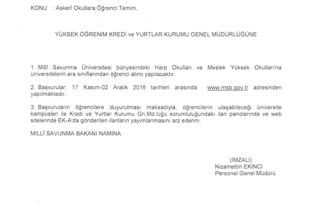 Milli Savunma Bakanlığının Yazısı;