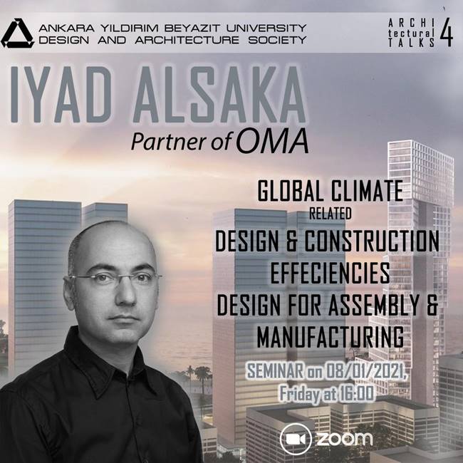 Ankara Yıldırım Beyazıt Üniversitesi Mimarlık ve Tasarım Topluluğu 8 Ocak Cuma günü Saat 16:00’da dünyaca ünlü mimarlık ofisi OMA ortaklarından Iyad Alsaka’ yı konuk edecek. Seminer konusu “Global Climate Related Design and Construction Efficiencies Design for Assembly & Manufacturing (Tasarım ve İnşâ Verimliliklerinde Küresel Durum ve Montaj ve İmalat için Tasarım)” olup, sunum dili İngilizce’dir.