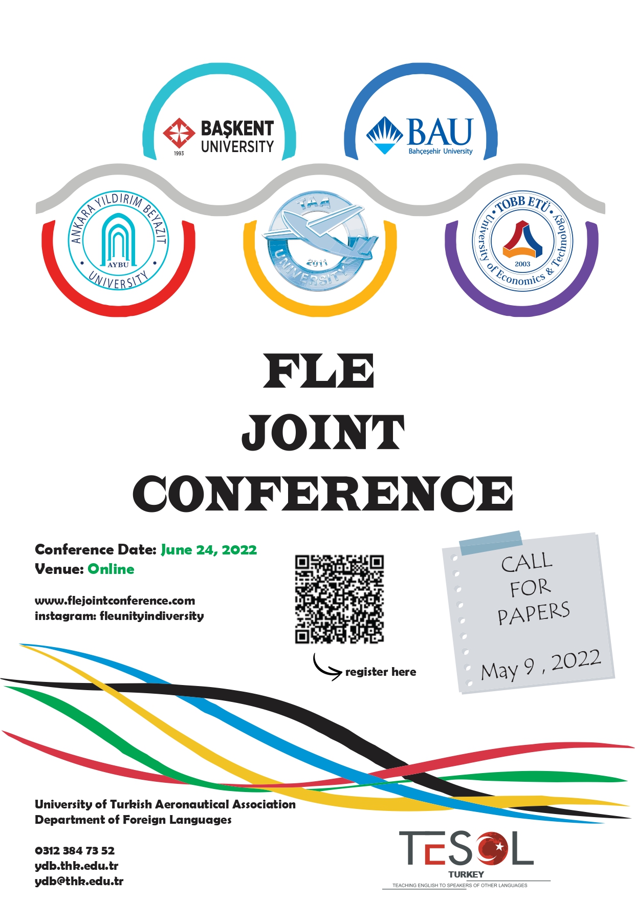Ankara Yıldırım Beyazıt Üniversitesi Yabancı Diller Yüksekokulu, Başkent Üniversitesi, Türk Hava Kurumu Üniversitesi, TOBB Ekonomi ve Teknoloji Üniversitesi ve Bahçeşehir Üniversitesi iş birliğiyle 24 Haziran 2022 tarihinde FLE JOINT CONFERENCE adlı çevrimiçi ortak konferans düzenlenecektir. Konferansa bildiri özeti son gönderim tarihi 9 Mayıs 2022 olarak belirlenmiştir. 2019 yılından beri gerçekleştirilen aynı temalı ortak konferansa AYBÜ Yabancı Diller Yüksekokulu öğretim görevlileri ile Türkiye’den, dünyadan ve ortak üniversitelerin hazırlık okullarından birçok öğretim görevlisi ve araştırmacı katılmış ve çeşitli sunumlar gerçekleştirmiştir.