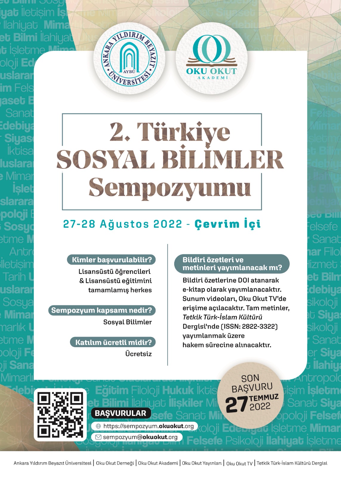 Üniversitemiz ile Oku Okut Derneği iş birliğinde Sosyal Bilimler alanında profesyoneller ile lisansüstü öğrencileri bir araya getirerek tecrübe aktarımına imkân sağlamak, disiplinler arası iletişimi ve çalışmaları güçlendirmek ve akademik üretime katkı sağlamak amacıyla 27-28 Ağustos 2022 tarihlerinde çevrim içi olarak 2.Türkiye Sosyal Bilimler Sempozyumu gerçekleştirilecektir.