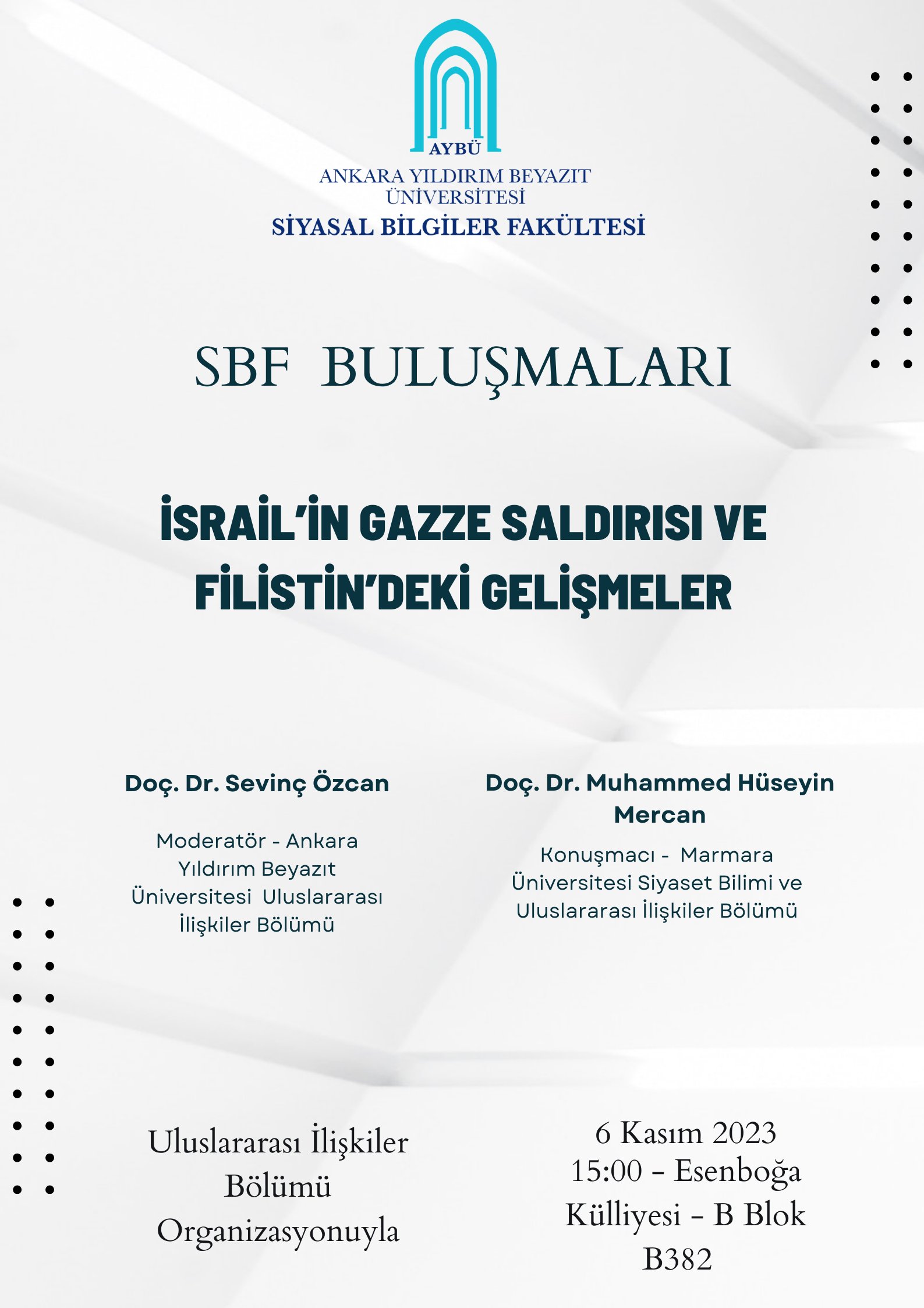 Bölümümüz organizasyonuyla 6 Kasım Pazartesi günü gerçekleştirilecek SBF buluşmasında Marmara Üniversitesi Siyaset Bilimi ve Uluslararası İlişkiler Bölümü'nden Doç. Dr. Muhammed Hüseyin Mercan konuşmacı olarak katkı sağlayacaktır.