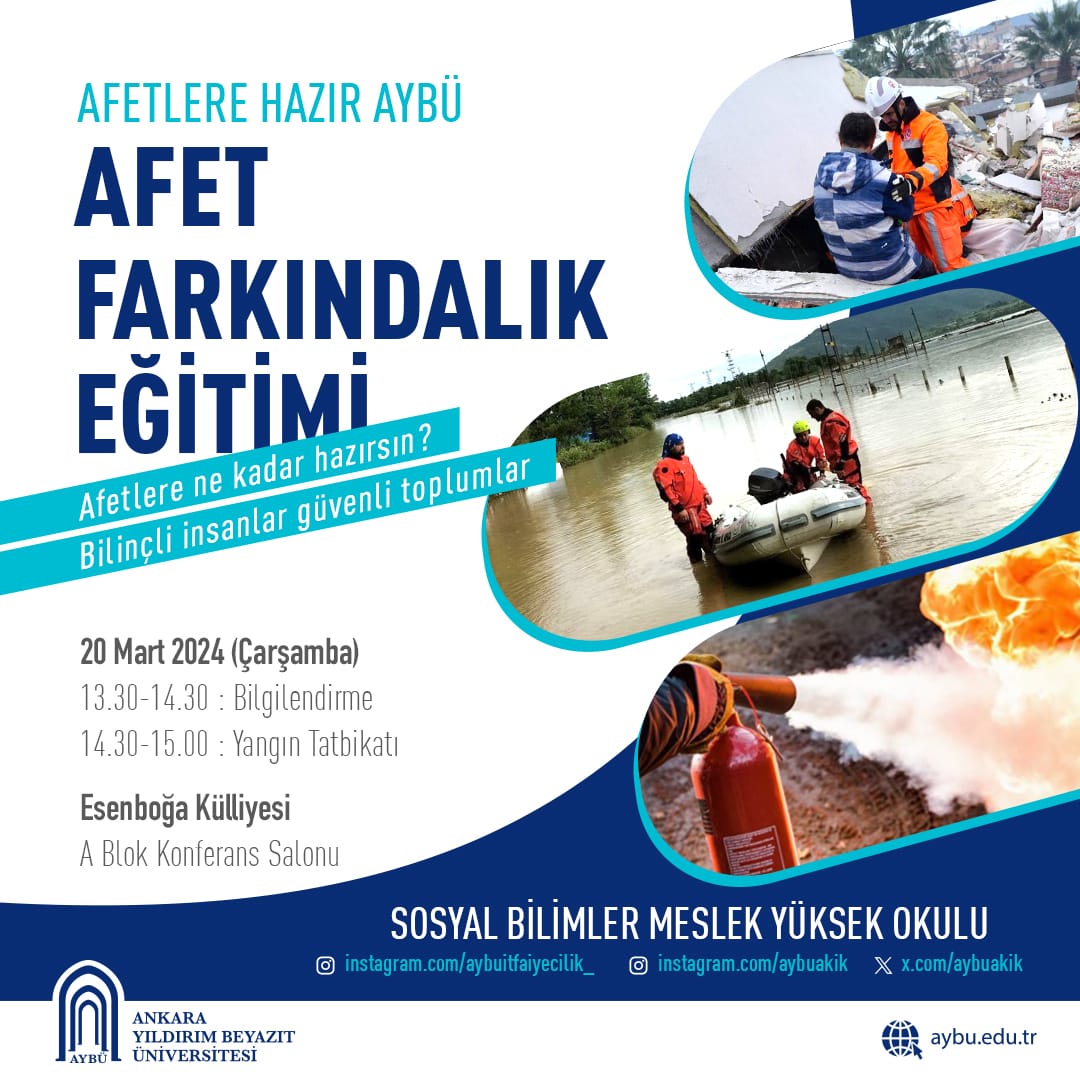 Sivil Savunma ve İtfaiyecilik Programı öğrencilerimiz tarafından " Afet Farkındalık Eğitimi " verilecektir. Tüm öğrencilerimiz ve akademisyenlerimiz davetlidir.