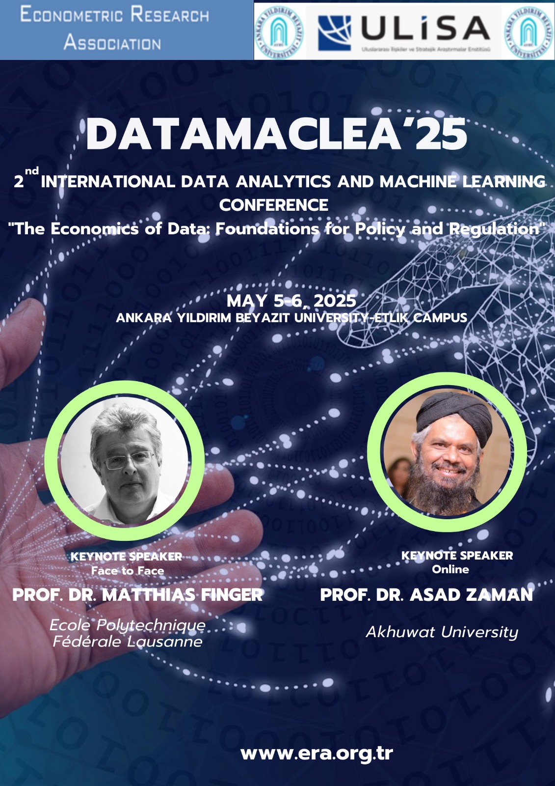 The 2nd International Data Analytics and Machine Learning Conference (DATAMACLEA’25), organized by the Econometric Research Association (ERA) in cooperation with Ankara Yıldırım Beyazıt University (AYBU) Institute for International Relations and Strategic Research (ULISA), will be held on 5-6 May 2025 at the Etlik Milli İrade Campus.