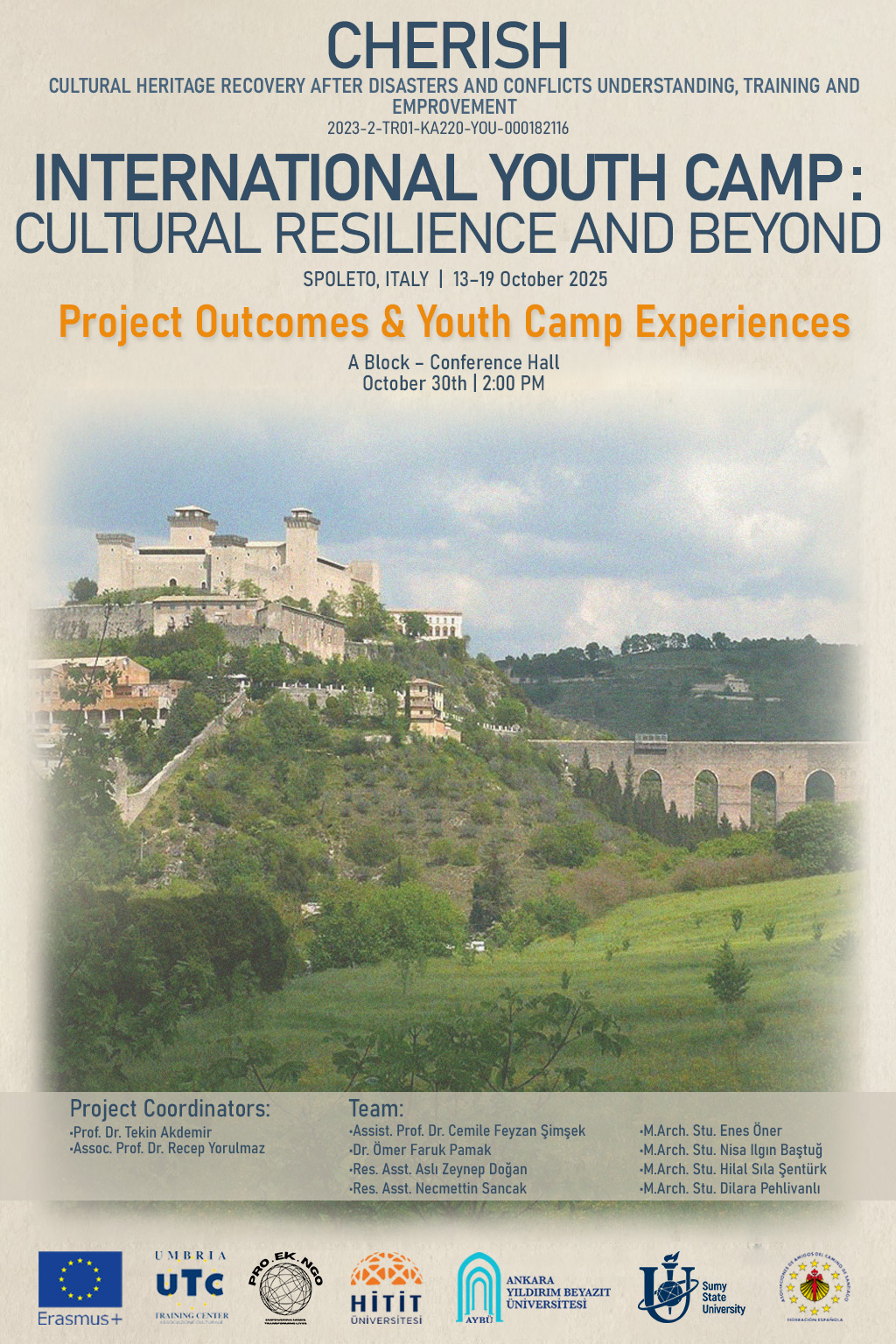 Kültürel mirasın afetler ve çatışmalar sonrasında korunması, anlaşılması ve gençlerin bu süreçteki rolünün güçlendirilmesini amaçlayan Erasmus+ programı kapsamında, Ankara Yıldırım Beyazıt Üniversitesi ortaklığında yürütülen CHERISH Projesi (2023-2-TR01-KA220-YOU-000182116) çerçevesinde, İtalya’nın Spoleto kentinde gerçekleştirilen Uluslararası Gençlik Kampı başarıyla tamamlandı. Kamp süresince elde edilen proje çıktıları ve gençlik kampı deneyimlerinin paylaşılacağı etkinlikte, kültürel dayanıklılık teması altında geliştirilen çalışmalar ve uluslararası iş birliği süreçleri tanıtılacaktır.