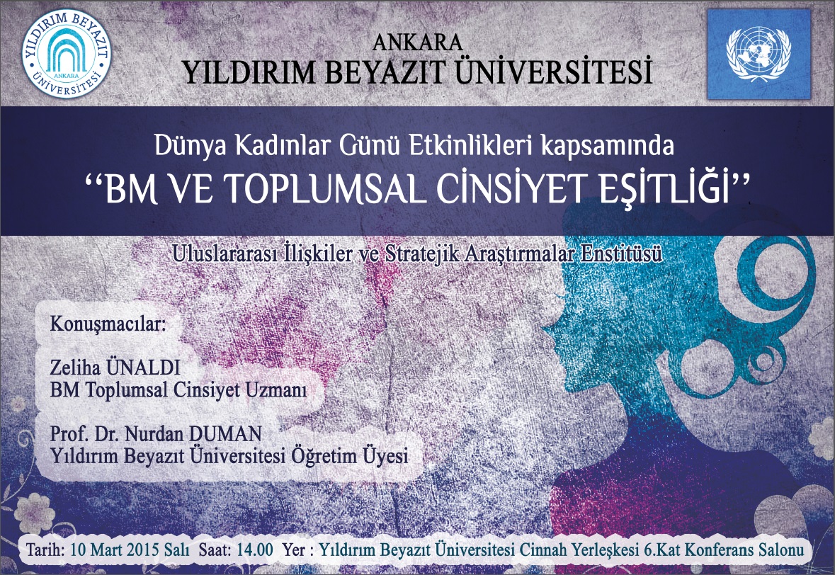 Uluslararası İlişkiler ve Stratejik Araştırmalar Enstitüsü(ULİSA) ve BM Türkiye Ofisi işbirliği ile organize edilen Dünya Kadınlar Günü Etkinlikleri kapsamında ‘BM ve Toplumsal Cinsiyet Eşitliği ‘ başlıklı seminerimiz 10 Mart 2015 tarihinde saat 14.00’da BM Kalkınma Programı Cinsiyet Eşitliği Uzmanı Zeliha Ünaldı  ve Yıldırım Beyazıt Üniversitesi Öğretim Üyesi Prof. Dr. Nurdan DUMAN’ın katılımları ile Üniversitemizin Cinnah Yerleşkesinde gerçekleştirilecektir. Seminerimize üniversitemizin tüm öğretim elemanları ve öğrenciler davetlidir.