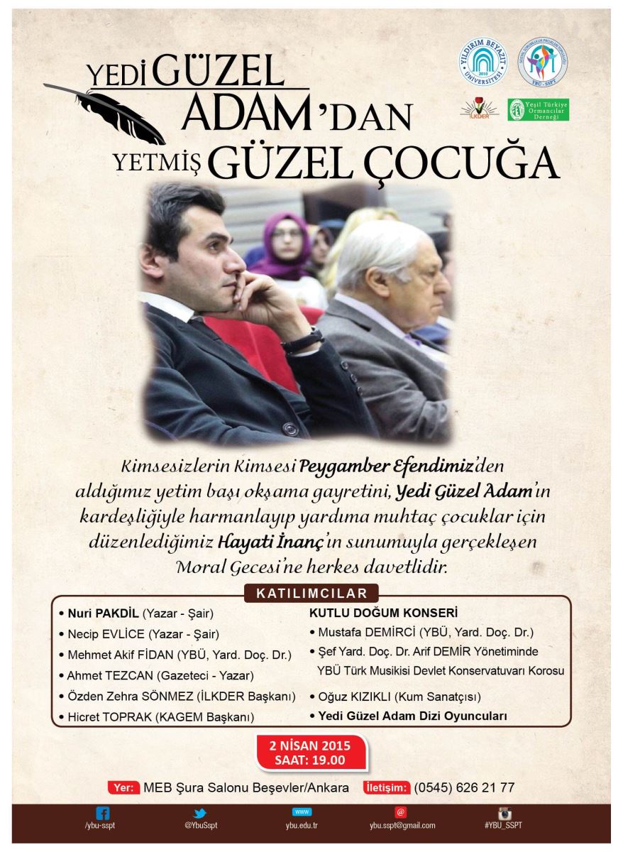 Sosyal Sorumluluk Projeleri Topluluğunun düzenlemiş olduğu "Yedi Güzel Adam'dan Yetmiş Güzel Çocuğa" etkinliği ve İslami İlimler Fakültesi ile Türk Musikisi Devlet Konservatuvarının ortaklaşa düzenledikleri Kutlu Doğum Konserini de içeren Kutlu Doğum Programına Üniversitemiz tüm mensupları davetlidir.