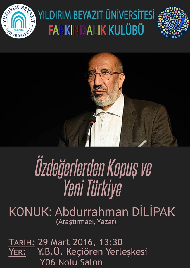 Üniversitemiz Farkındalık Öğrenci Kulübü organizasyonunda Araştırmacı-Yazar Abdurrahman DİLİPAK'ın konuşmacı olarak katılacağı "Özdeğerlerden Kopuş ve Yeni Türkiye" konulu panel 29 Mart 2016 Salı günü saat 13:30'da Ovacık Yerleşkemizde gerçekleştirilecektir.
