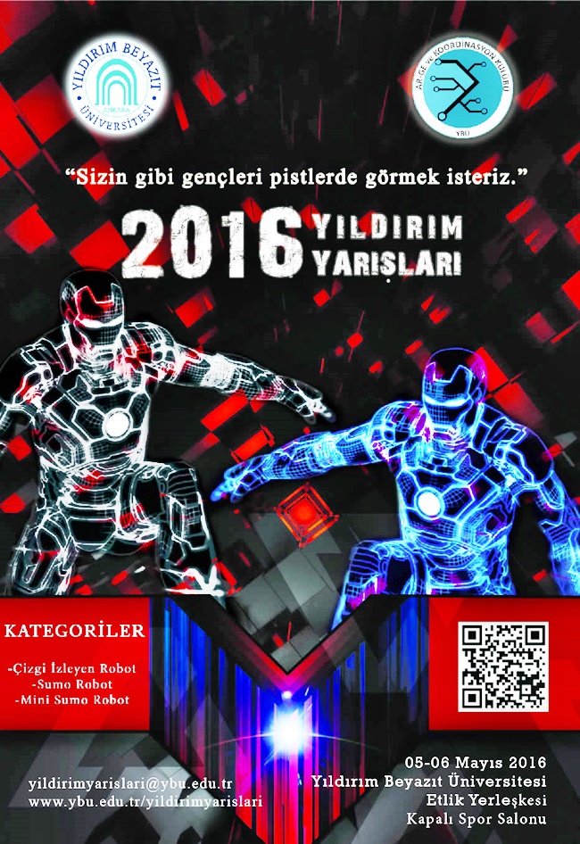 05-06 Mayıs 2016 Üniversitemiz Etlik Yerleşkesi’nde gerçekleştirilecek Yıldırım Yarışlarında Çizgi İzleyen Robot, Sumo Robot ve Sini Sumo Robot kategorilerinde yarışmalara tüm öğrenciler katılabilirler.