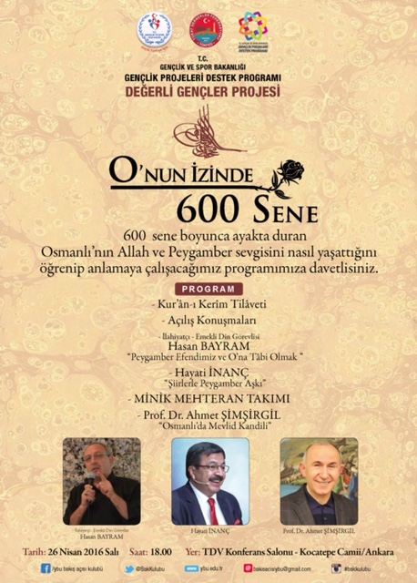 T.C. Gençlik ve Spor Bakanlığı’nın  desteğiyle Tokat Dernekler Federasyonu’nca yürütülen ve koordinatörlüğünü  Üniversitemiz öğretim üyesi Prof.Dr.Ertuğrul YAMAN’ın yaptığı Değerli Gençler Projesi kapsamında Üniversitemiz Bakış Açısı Öğrenci Kulübü işbirliğiyle düzenlenen Kutlu Doğum Programı: “O'nun İzinde 600 Sene” 26 Nisan 2016 Salı günü saat 18:00 TDV Konferans Salonu'nda  gerçekleştirilecektir. Üniversitemiz personeli davetlidir.