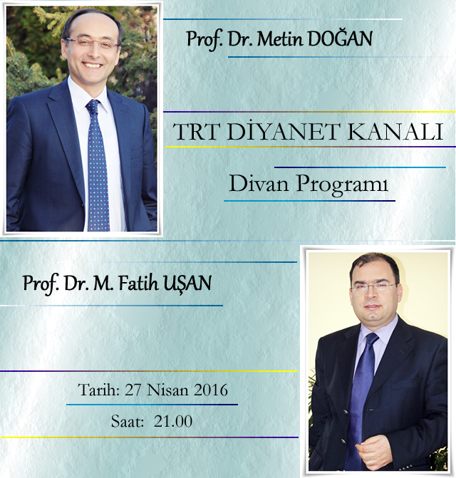 Üniversitemiz Rektörü Prof. Dr. Sayın Metin DOĞAN ve Rektör Yardımcımız Prof. Dr. M. Fatih UŞAN 27 Nisan 2016 21:00'de TRT Diyanet kanalında Moderatörlüğünü Yrd. Doç. Dr. M. Enes KALA'nın yaptığı Divan programına konuk olacaklar.