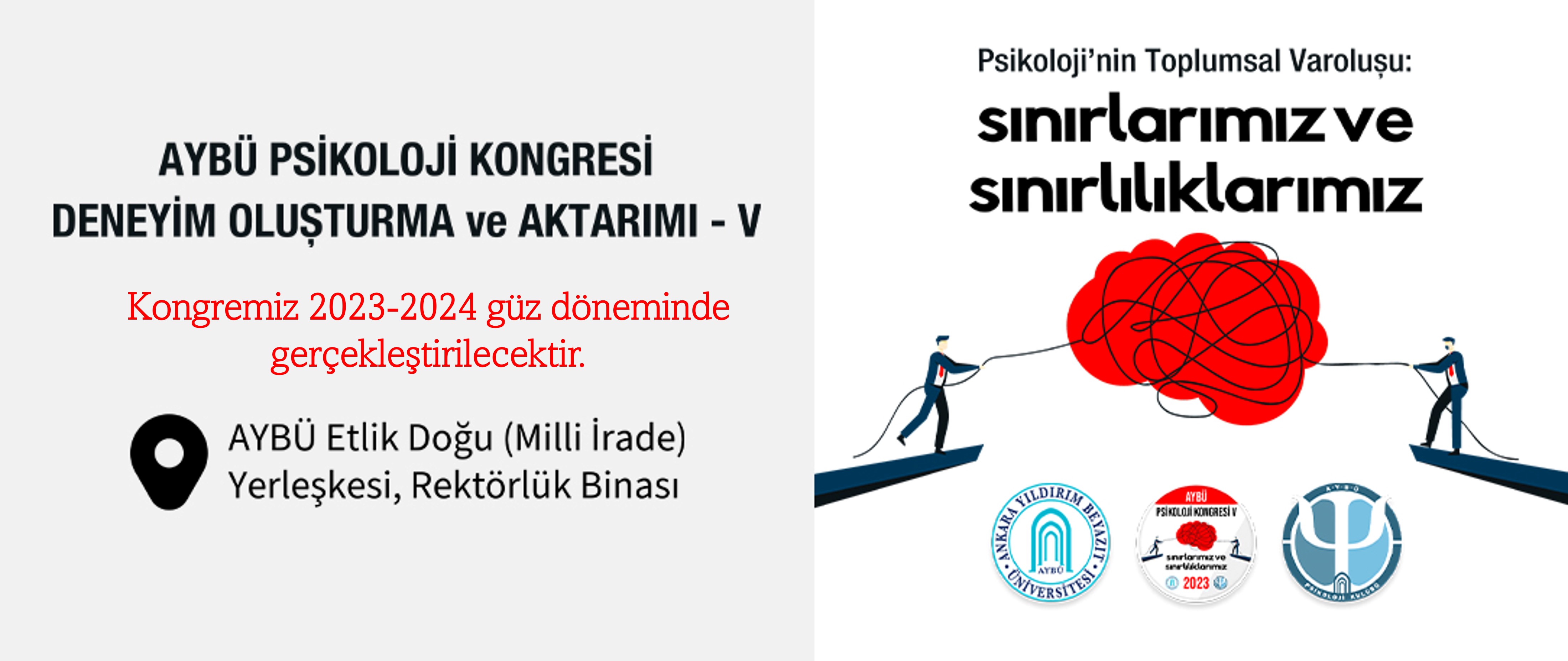 AYBÜ Psikoloji Kongresi: Deneyim Oluşturma ve Aktarımı-V, "Psikolojinin Toplumsal Varoluşu: Sınırlarımız ve Sınırlılıklarımız" temasıyla 3-5 Mayıs 2023 tarihlerinde AYBÜ Etlik Doğu (Milli İrade) Yerleşkesi'nde gerçekleştirilecektir.