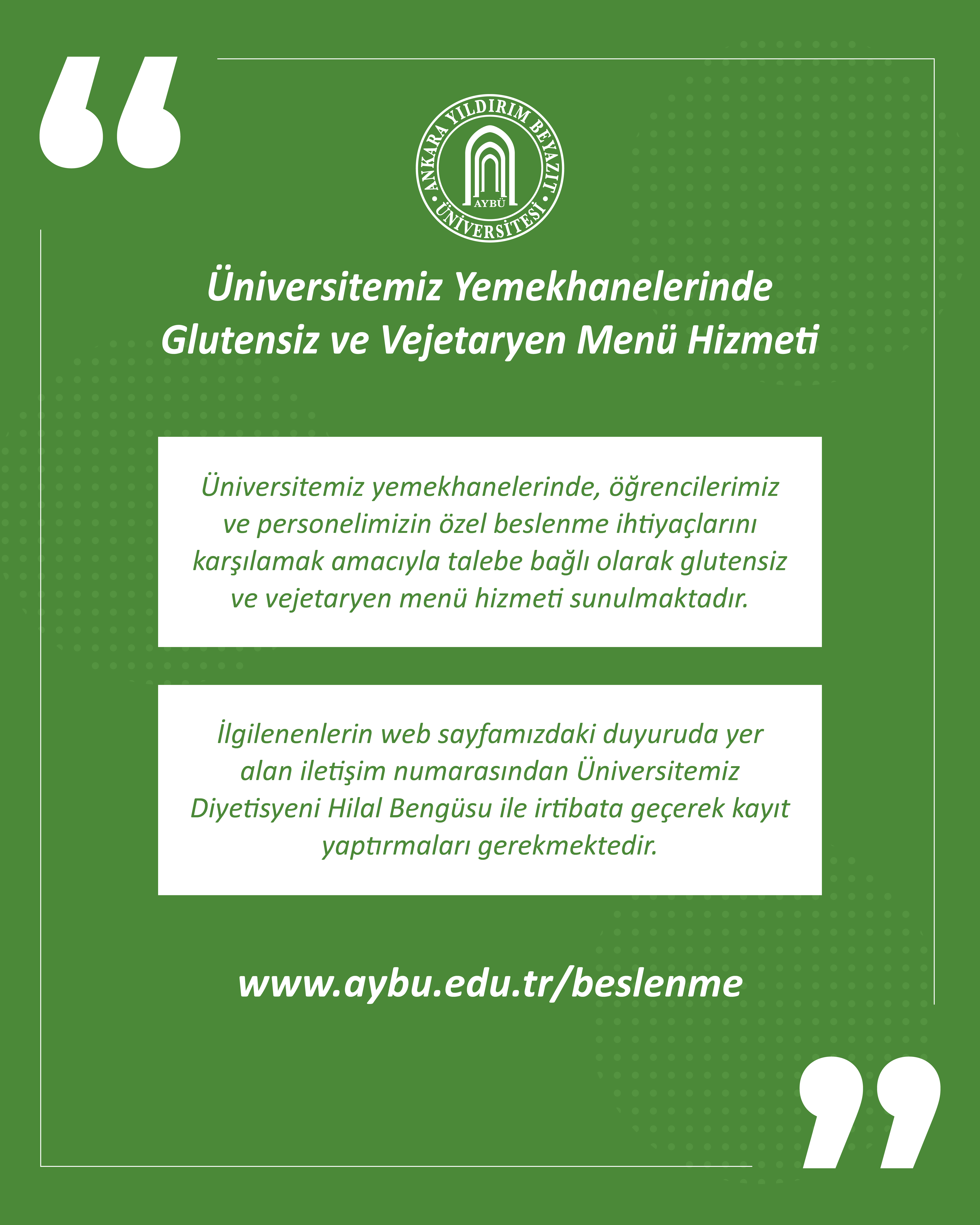 Üniversitemiz yemekhanelerinde, öğrencilerimiz ve personelimizin özel beslenme ihtiyaçlarını karşılamak amacıyla talebe bağlı olarak glutensiz ve vejetaryen menü hizmeti sunulmaktadır. 🌿🍽️