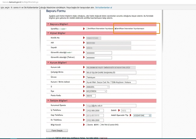 • Sertifika: Size iki seçenek sunulacaktır. Siz Sertifikam internetten Yayınlanmasın seçeniğini seçiniz.