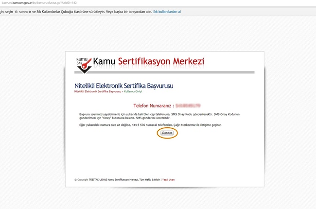 Form onaylandıktan sonra SMS Onay Kodu gönderim ekranı (Şekil 3) görüntülenecektir. Başvuru formunu doldururken Cep Telefonu alanına girdiğimiz Cep Telefonu numarası görüntülenir. Gönder butonuna basıldığında ekranda görüntülenen cep telefonu numarasına SMS Onay Kodu gider.