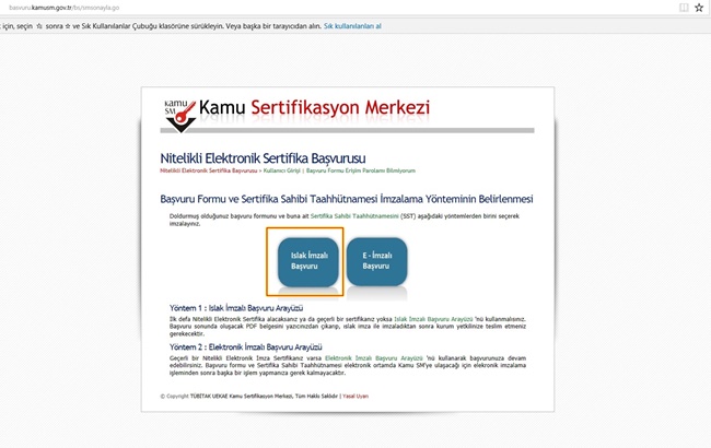 SMS Onay Kodu doğru girildiğinde Başvuru Formu ve Sertifika Sahibi Taahhütnamesi İmzalama Yönteminin Belirlenmesi sayfasına ulaşılır.