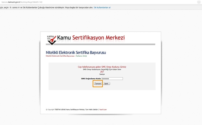 SMS Onay Kodu giriş ekranındaki SMS Doğrulama Kodu alanına cep telefonuna gelen SMS Onay Kodu girilir ve Tamam butonuna basılır. ( Şekil 4 )