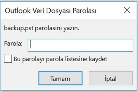 Gözat butonuna tıklanarak önceden kaydedilen “.pst” uzantılı Outlook Veri Dosyası seçilip İleri butonuna tıklanır. Dosya şifreli ise şifre girildikten sonra Tamam butonuna tıklanır.