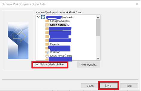 5 – Alt Klasörler E-posta hesabınız seçilir, tüm hesabın ve klasörlerin yedek dosyasına dahil edilmesi için ‘Alt Klasörlerle Birlikte’ seçeneği işaretlenir ardından İleri butonuna tıklanır.