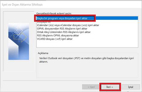 “Başka bir programdan veya dosyadan içeri aktar” seçeneği işaretlenip İleri butonuna tıklanır.
