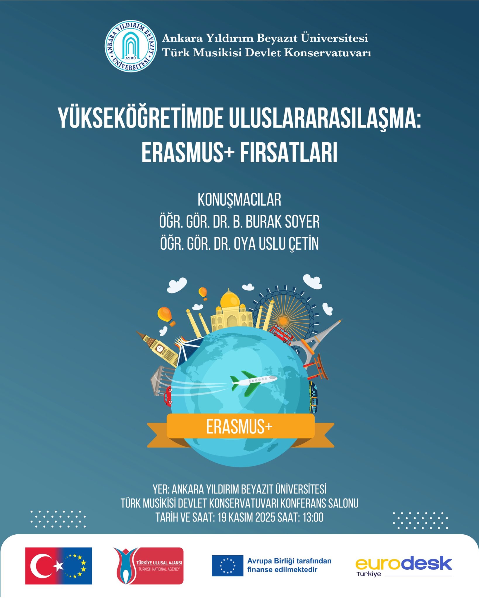 AYBÜ Dış İlişkiler Koordinatörlüğü olarak, üniversitemizde AYBÜ Türk Musikisi Devlet Konservatuvarı ev sahipliğinde düzenlenecek olan etkinlikte katılımcılarla Türkiye Ulusal Ajansı ve Eurodesk fırsatlarını paylaşacağız. Erasmus+ fırsatlarına ilgi duyan tüm öğrenci ve personelimiz davetlidir.