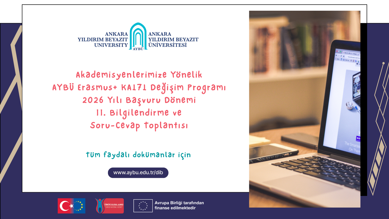 Dış İlişkiler Koordinatörlüğümüz tarafından organize edilen “AYBÜ Erasmus+ KA171 Değişim Programı 2026 Yılı Başvuru Dönemi II. Bilgilendirme ve Soru-Cevap Toplantısı”, 28 Ocak 2026 Çarşamba günü çevrim içi olarak başarıyla gerçekleştirilmiştir. Toplantımıza katılım sağlayarak görüş, öneri ve katkı sunan tüm akademisyenlerimize teşekkür ederiz. Toplantıya katılamayan ve/veya içeriği tekrar incelemek isteyen akademisyenlerimiz için toplantı sunumu ve video kaydı aşağıdaki bağlantılar üzerinden erişime açılmıştır.