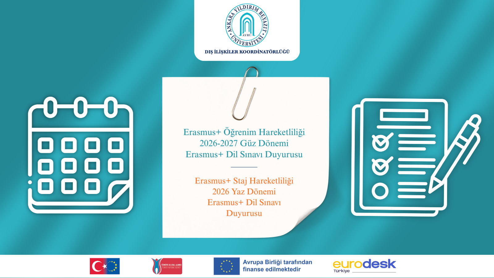 Erasmus+ dil sınavı iki aşamada gerçekleştirilecektir. 28 Şubat 2026 saat 14.00’te AYBÜ Yabancı Diller Yüksekokulu tarafından gerçekleştirilecek olan yazılı kısımdan yalnızca gerekli asgari puanı (52,5/75) alabilen öğrencilerimiz 7 Mart 2026 saat 14.00’te düzenlenecek olan sözlü sınava girebileceklerdir.
