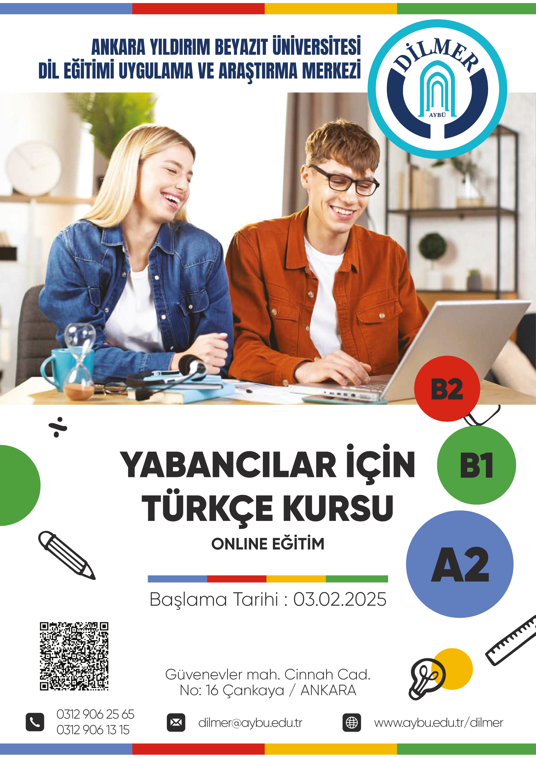 AYBÜ DİLMER’de 03.02.2025 tarihi itibari ile A2-B1-B2 Online Türkçe dersleri başlayacaktır. Online kurslara katılmak isteyen öğrencilerimizin aşağıdaki linkte belirtilmiş olan formu doldurarak ön kayıtlarını gerçekleştirmeleri gerekmektedir.