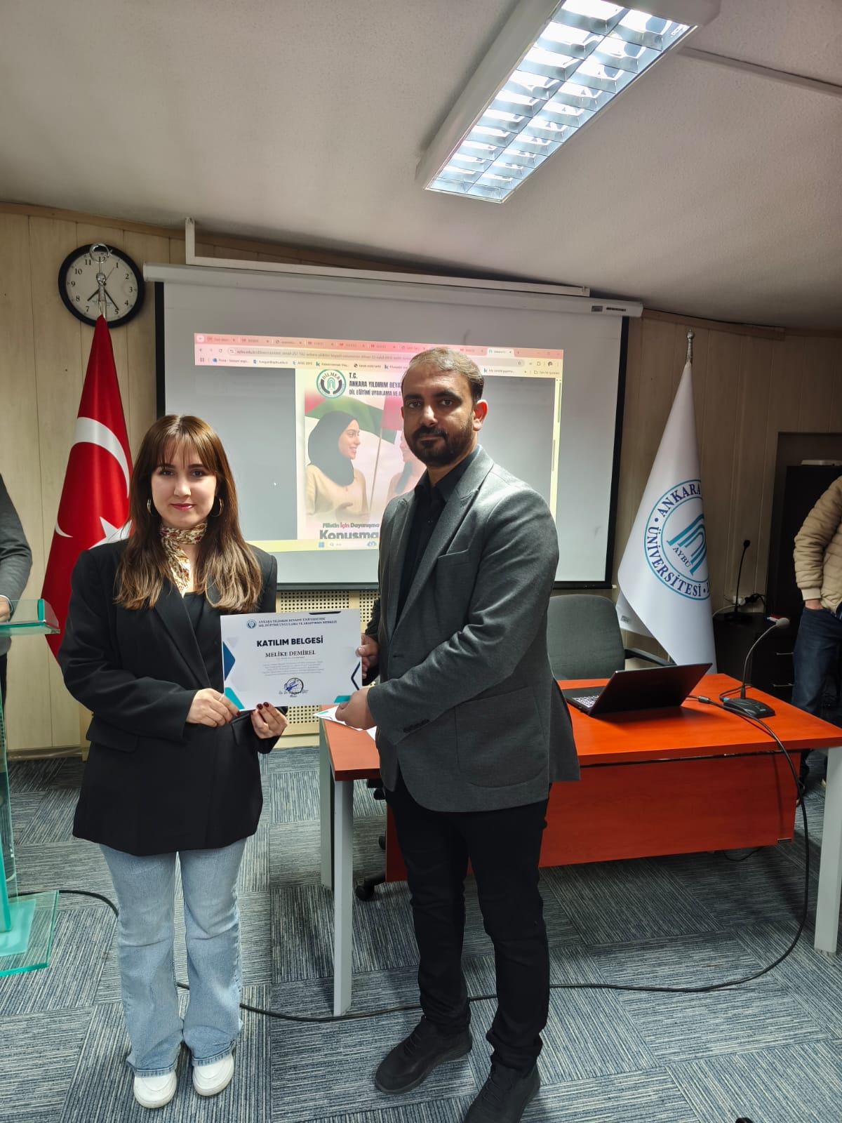 Üniversitemiz Dilmer bünyesindeki Filistinli kursiyerlerin Türkçe konuşma becerilerini geliştirmek ve ülkemize uyum sağlamalarını kolaylaştırmak için Türkçe konuşma etkinliği başlatıldı. Üniversitemizden gönüllü 35 Türk öğrencinin konuşma etkinliği öncesi eğitime alındığı programda, Savaş Sonrası Psikolojik Destek Uygulamaları, Dil ve Konuşma Terapisi Uygulamaları, Eğitim Psikolojisi ve Motivasyon, Yabancı Dil Olarak Türkçe Eğitimi konularında alan uzmanları tarafından sunumlar yapıldı. 30 Nisan 2025 tarihinde başlayan ve 30 Haziran 2025’e kadar devam edecek etkinlikler kapsamında Filistinli öğrencilerle Türk öğrencilerin belirlenen konularda Türkçe sohbet ederek konuşma becerilerinin geliştirilmesi hedeflenmektedir.