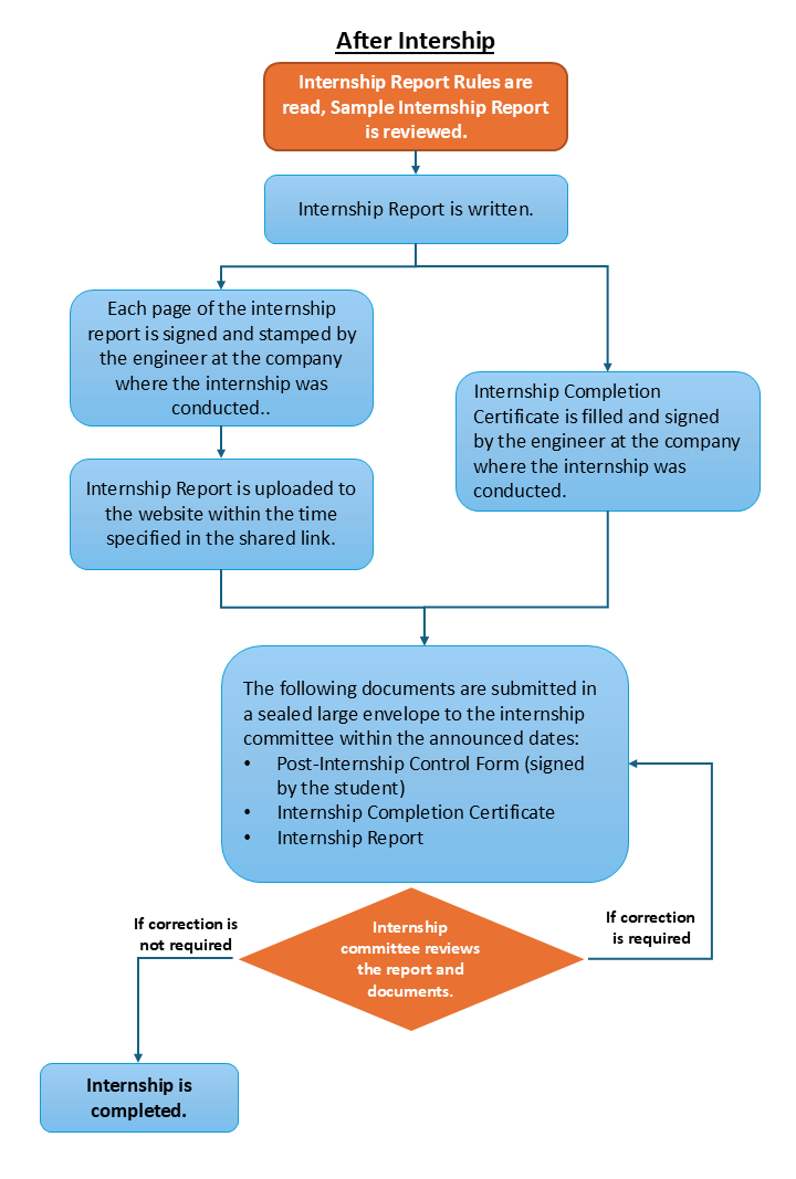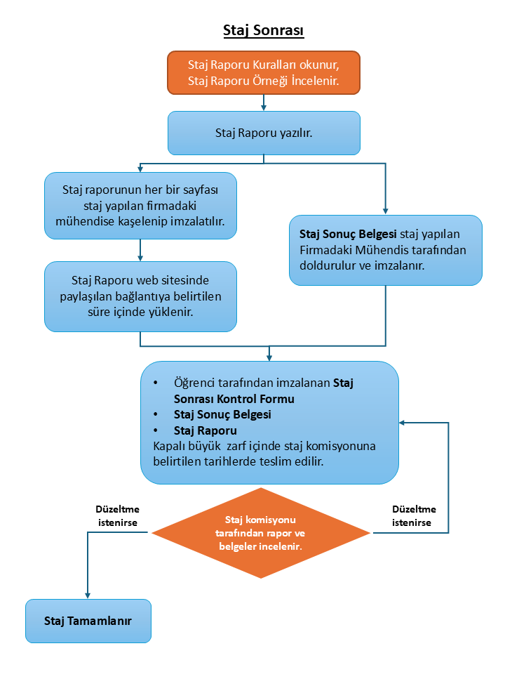 Stajını tamamlayan öğrenciler akademik takvimde belirtilen Lisans Eğitim ve Öğretim Yılı için Güz Dönemi Ders Başlangıç tarihinden itibaren 2 hafta içerisinde paylaşılan bağlantıya yüklenmesi gerekmektedir. STAJ RAPORU (ingilizce yazılmış), STAJ SONRASI KONTROL FORMU ve STAJ DEĞERLENDİRME-SONUÇ BELGESİ staj komisyonuna teslim etmekle yükümlüdür. Rapor ve formlar duyurulan tarihte sunumun yapılacağı 3. hafta içinde teslim edilmesi gerekmektedir. STAJ SONRASI KONTROL FORMU ve STAJ DEĞERLENDİRME-SONUÇ BELGESİ kapalı zarfta olmalıdır.