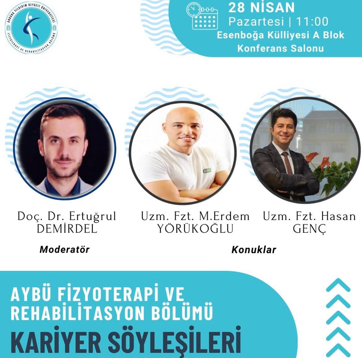 Turkey Physiotherapists Association Board of Directors member M. Erdem YÖRÜKOĞLU and Hasan GENÇ will meet with our students on Monday, April 28 at 11:00 at the Esenboğa Complex A Block Conference Hall as part of the AYBU Physiotherapy and Rehabilitation Department Career Talks, which will be moderated by Assoc. Prof. Ertuğrul DEMİRDEL.