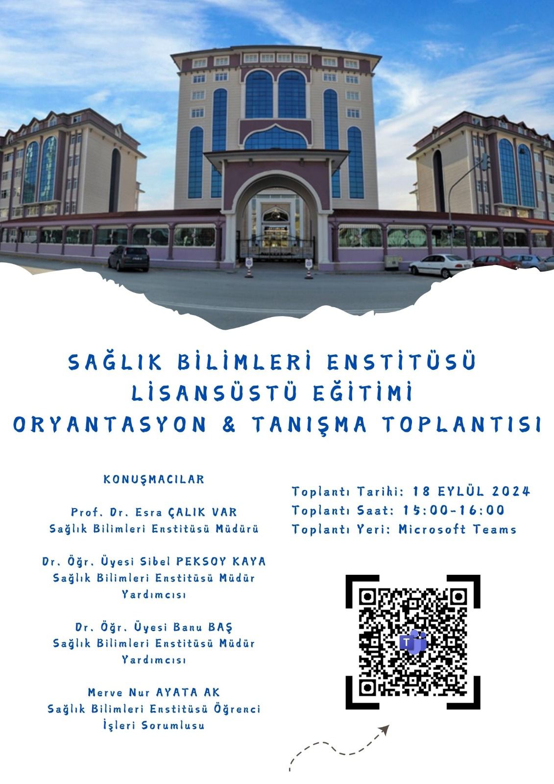 Sağlık Bilimleri Enstitüsü lisansüstü eğitimi oryantasyon ve tanışma toplantısı 18.09.2024 tarihinde saat 15.00-16.00 arasında gerçekleştirilecektir.