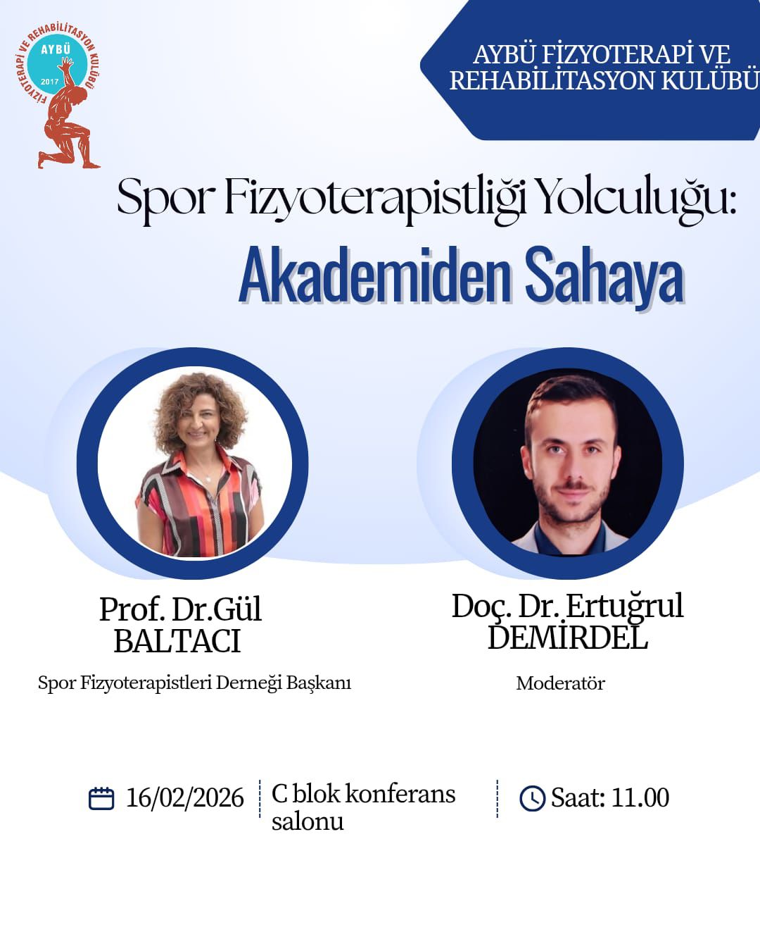 Fizyoterapi ve Rehabilitasyon Kulübümüzün organizasyonu ile Spor Fizyoterapistleri Derneği Başkanı Prof. Dr.Gül BALTACI hocamızın anlatımı ve bölümümüz öğretim üyesi Doç. Dr. Ertuğrul DEMİRDEL hocamızın moderatörlüğünde gerçekleştirilecek olan "Spor Fizyoterapistliği Yolculuğu: Akademiden Sahaya" etkinliğine tüm hocalarımız ve öğrencilerimiz davetlidir.
